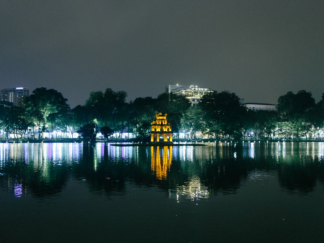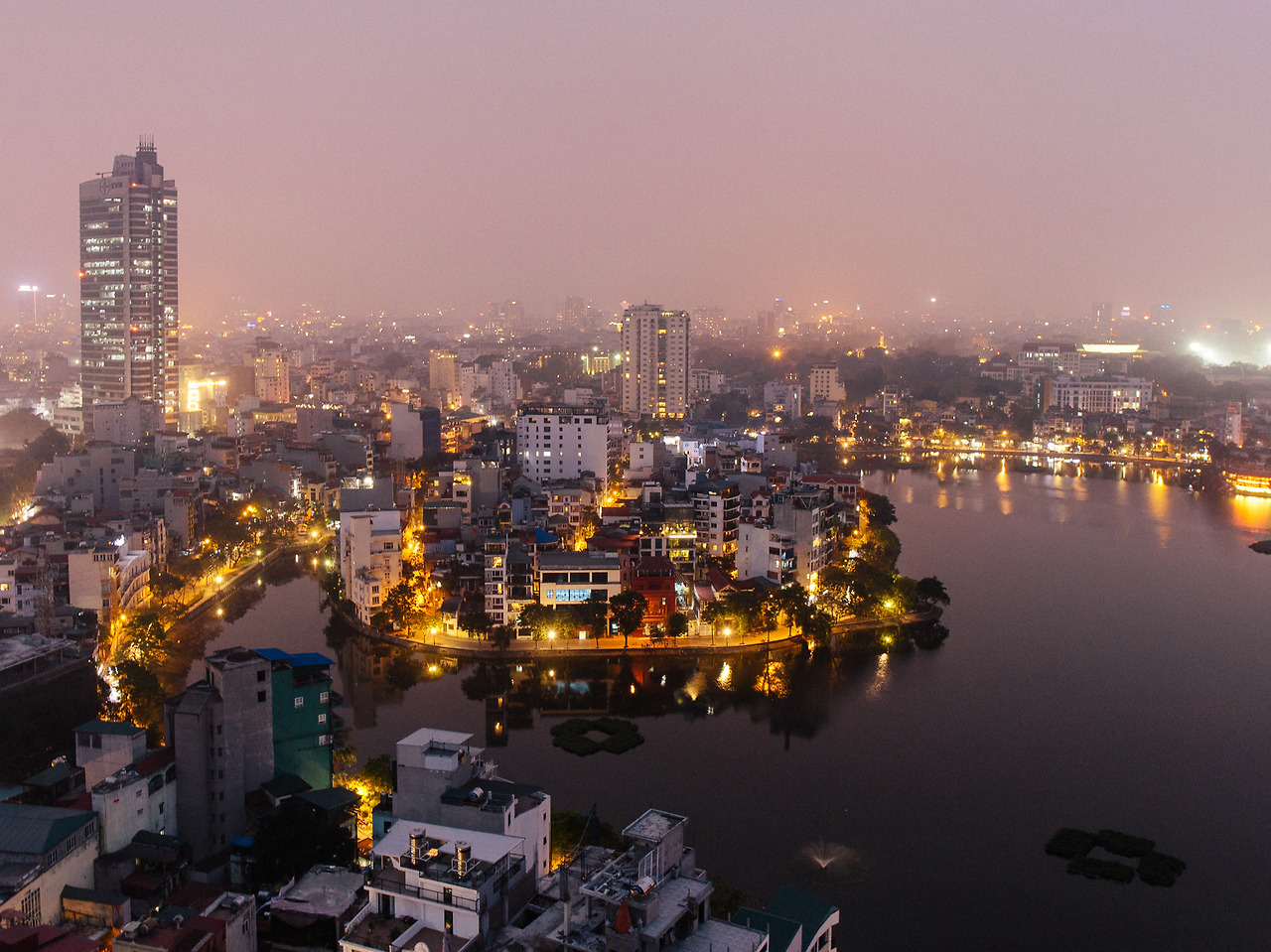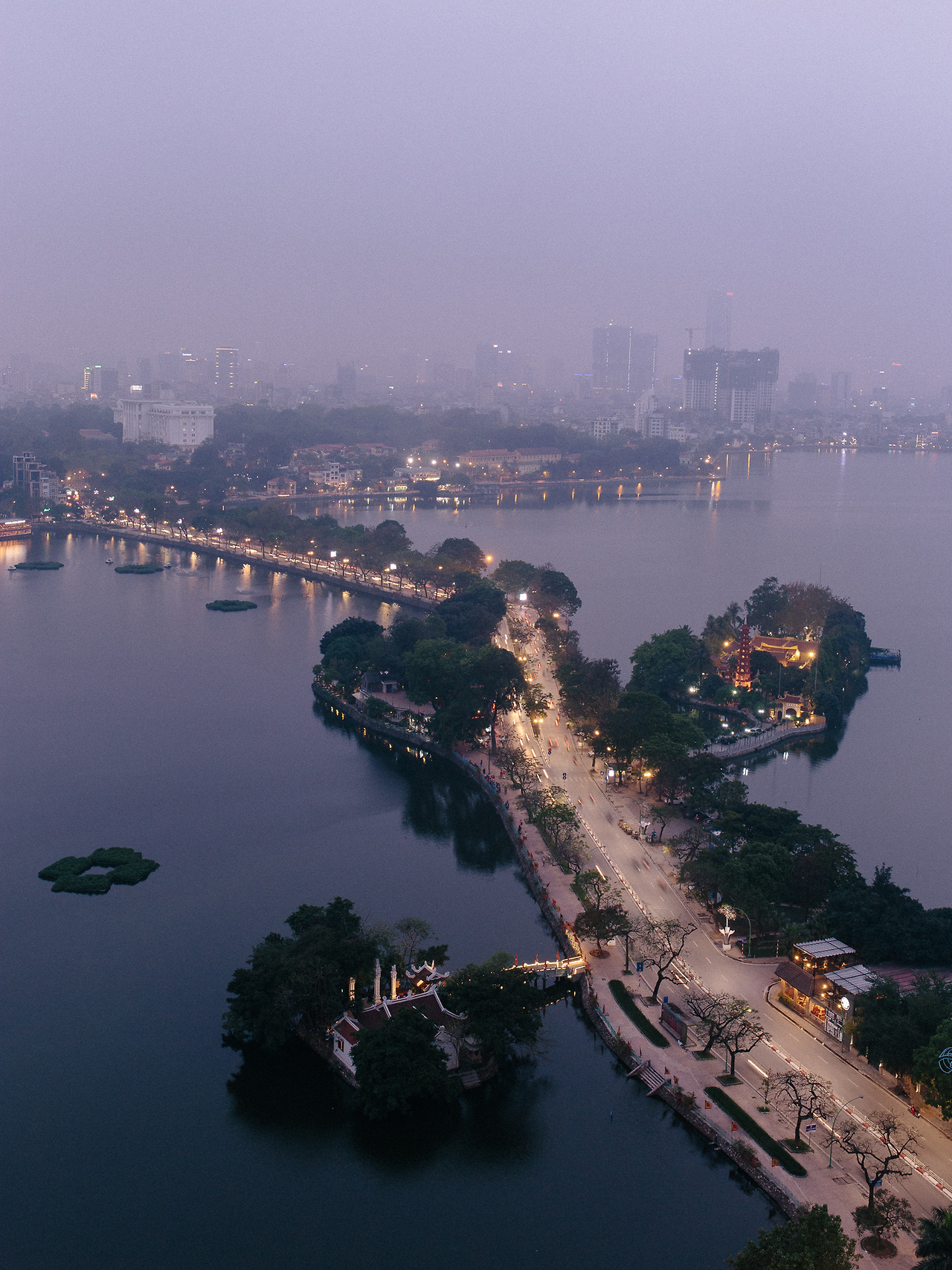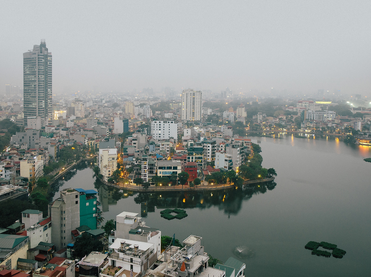 커피와 함께 나온 초콜릿 2개를 다 먹어도 아직 탄니엔 산책길의 가로등과 쩐꾸옥 사원의 조명은 들어오지 않는다. 잠시 다른 곳을 둘러봐야겠다. 써밋 라운지의 또 다른 뷰 포인트는 쭉 박 호수 한켠에 있다. 처음 베트남 여행을 계획했을 때 낮은 건물들이 섬처럼 쌓여있는 듯한 독특한 풍경을 보고 호치민 대신 하노이를 선택하게 되었다. 말하자면 내가 생각한 최초의 하노이는 이런 이미지였다.