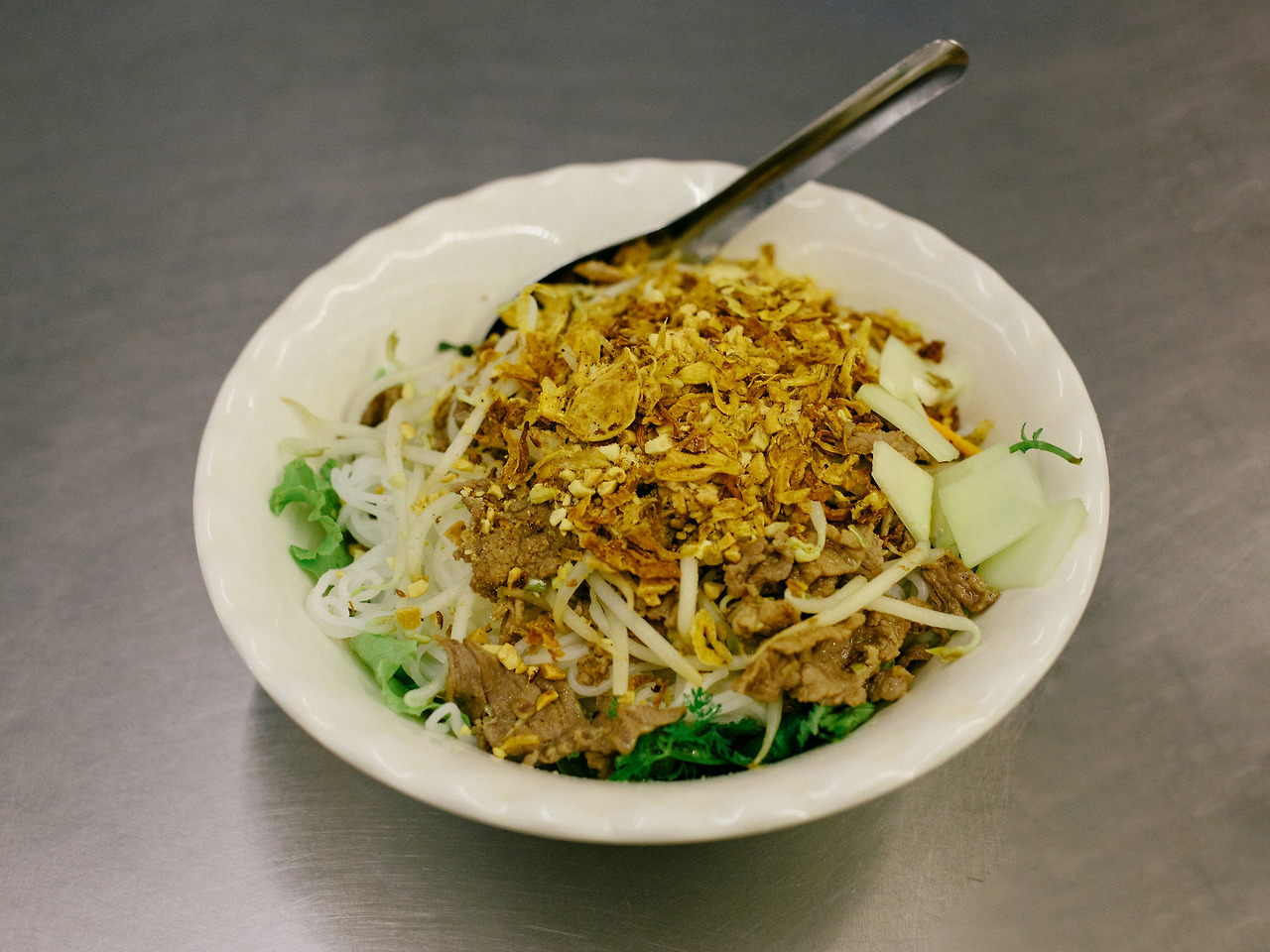 자리에 앉아 어떻게 주문하는 게 좋을지 고민하는 사이 테이블 앞으로 접시 하나가 놓인다. 여기서는 무조건 분보남보는 주문해야 하는 건가 보다. 추가로 사이공 비어 1병과 Dumpling Cake라고 하는 사이드 메뉴를 주문한다. 소스 통과 젓가락이 꽂혀있는 테이블을 보면 작년 고독한 미식가 여행이 떠오른다. 우선 분보남보는 땅콩 가루와 숙주, 숯불 향이 나는 고기, 달콤한 소스까지 맛이 없을 수 없는 구성이다. 쌀로 만든 면 아래에는 생각보다 소스가 많이 들어가 있어서 처음에 왜 수저를 함께 내주었는지 이제 이해가 된다. 오후 늦게 반미 샌드위치를 너무 늦게 먹어서인지 금세 배가 부르다.