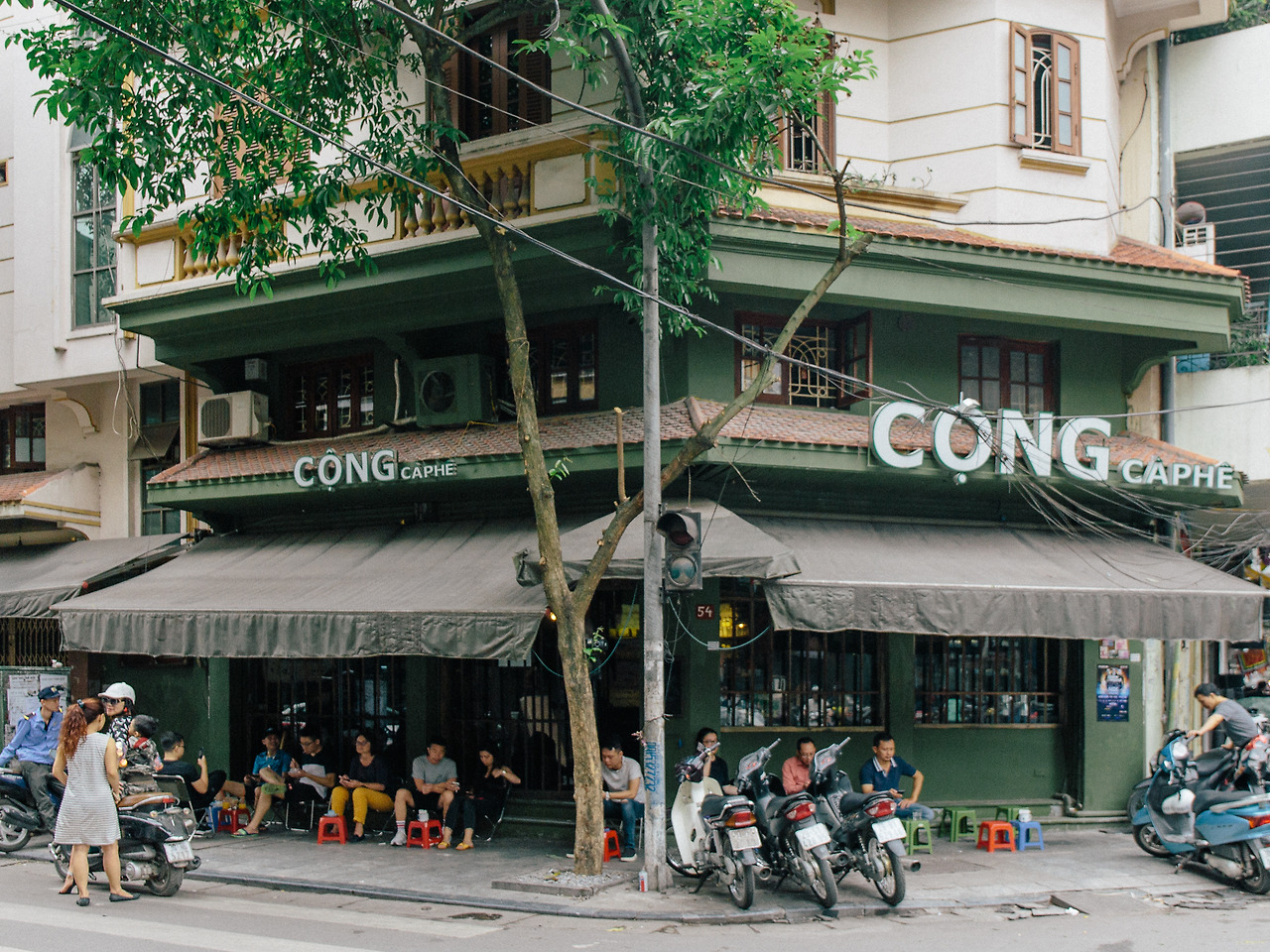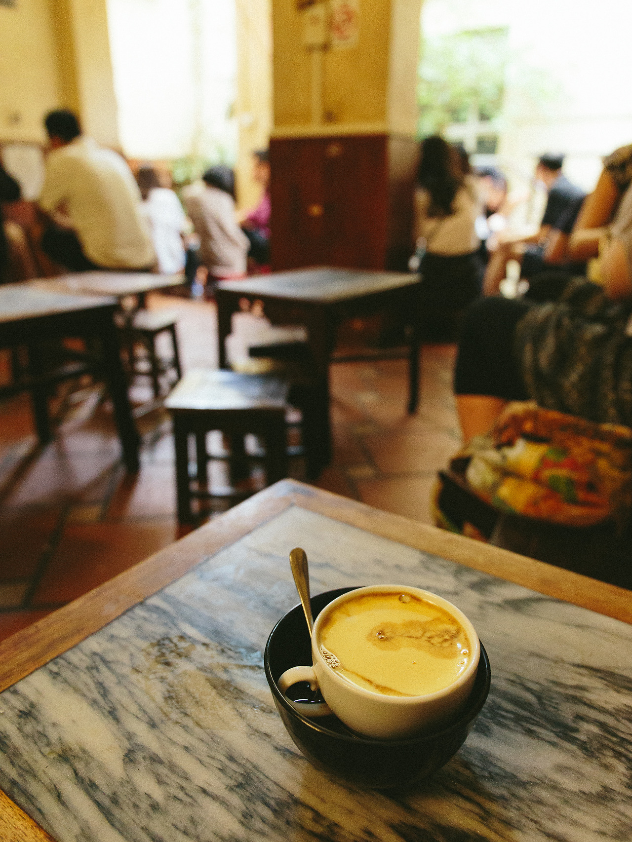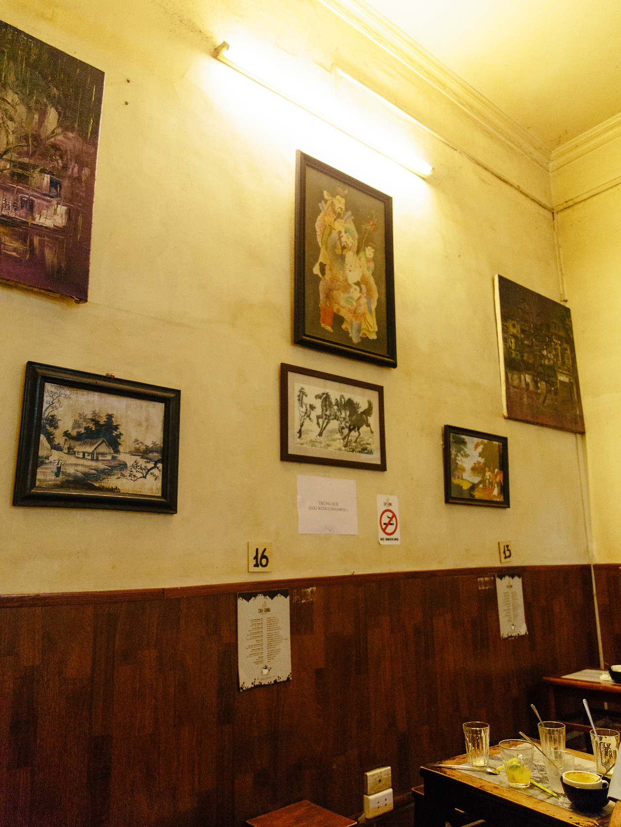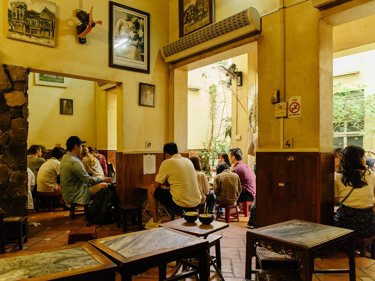 카페 지앙 Cafe Giang이라는 이름 대신 에그 커피라고 부르는 사람이 있을 정도로 유명한 메뉴가 있는 오래된 카페. 간판에 쓰인 Since 1946이라는 글귀 뒤로 벽에 걸려있는 흑백 가족사진이 자연스럽게 시선을 사로잡는다. 어두침침한 1층의 테이블에는 아무도 없고 위에서 소란스러운 소리와 환한 빛이 쏟아져 내린다. 벽을 타고 흐르는 식물이 가득한 좁은 계단을 오른다. 2층 안쪽도 그리 밝은 편은 아니지만 계단 근처의 채광이 좋아 분위기가 좋아 보인다.