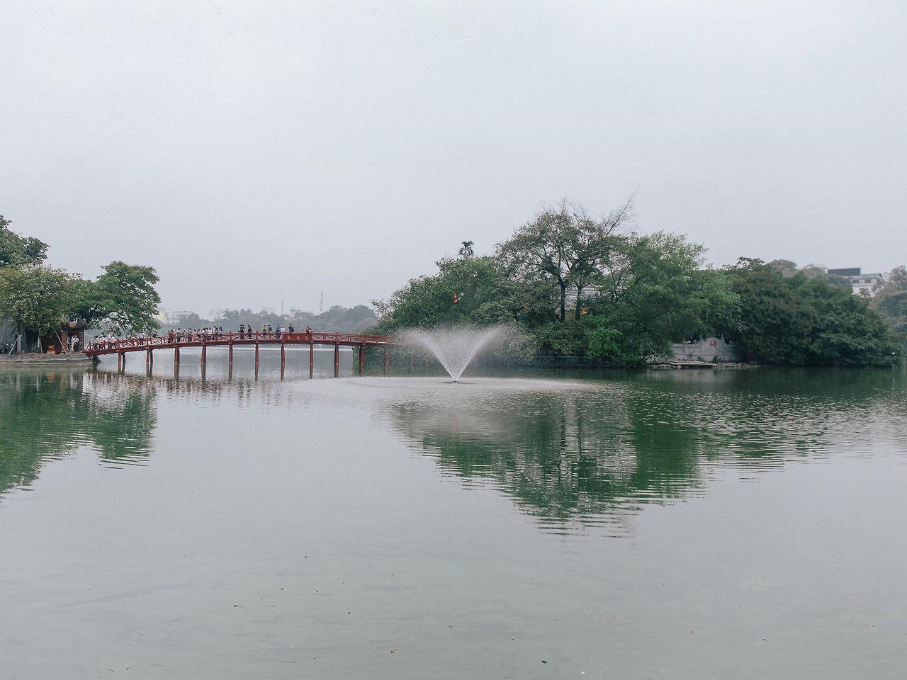 이끼가 많이 껴서 안이 제대로 보이지 않는 녹색 호수. 하노이의 다른 거리와 마찬가지로 호안끼엠 호수 주위에도 울창한 나무들이 숲처럼 줄지어 있다. 유난히 힘이 빠진 몇몇 나무들이 호수에 빨려들듯이 쳐진 모습이 인상적이다. 서울에서 수평으로만 한강을 산책하던 나로서는 경치가 완전히 바뀌는 원형의 산책이 상당히 색다르다. 게다가 오늘은 주말. 호수 안쪽으로도 바깥쪽으로도 호안끼엠 호수에는 여유로움이 넘쳐흐른다.