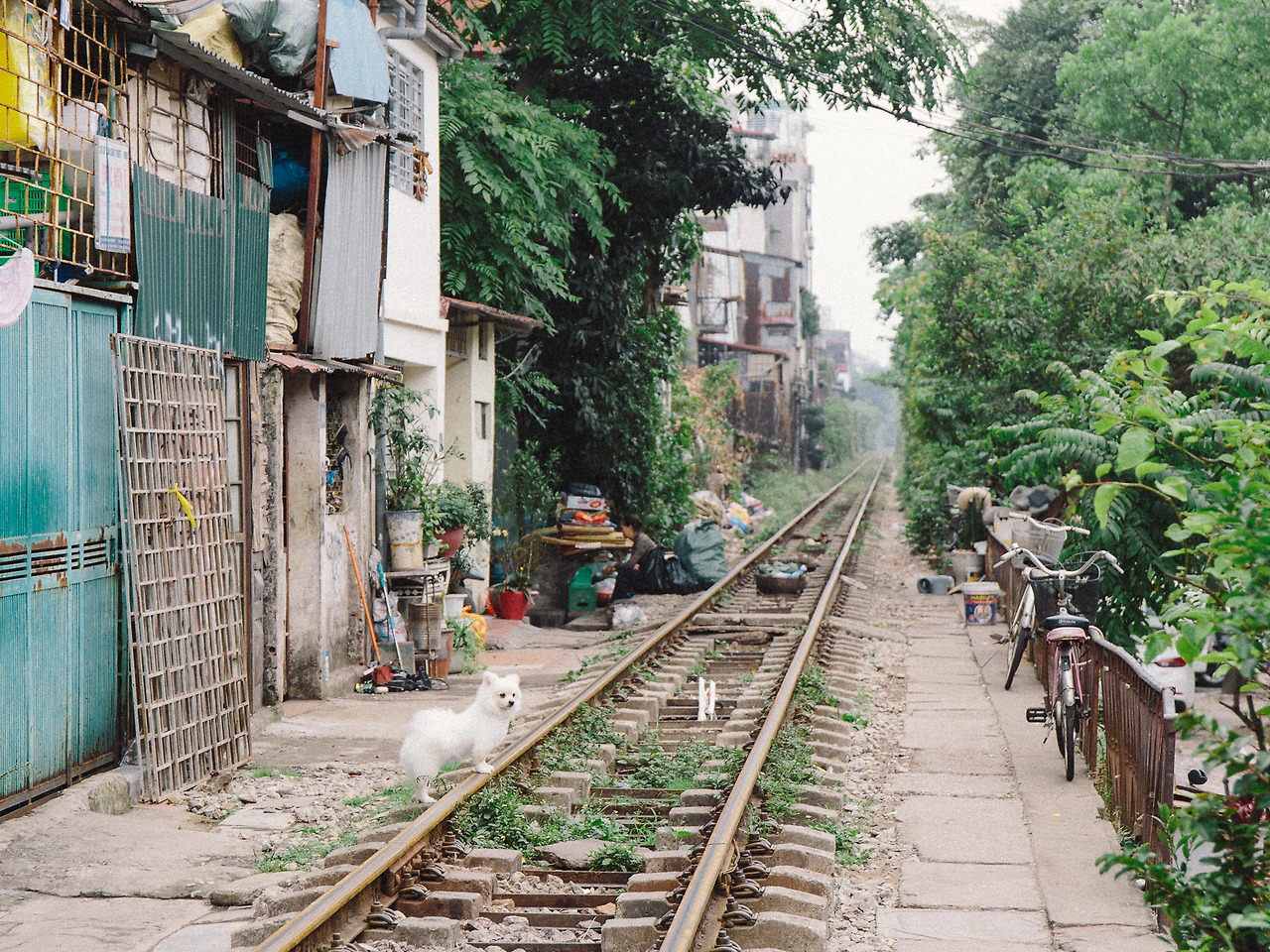 어느 집에서 나온 건지 솜사탕 같이 하얀 강아지 한 마리가 노련한 자세로 건너편을 관찰하고 있다. 천진난만한 표정의 꼬마와 함께 레일에 끼인 풀을 뽑고 있는 엄마의 모습. 그 옆에는 아까 그놈이 시루떡처럼 축 처져 있다. 아마 이 집에서 키우는 녀석이었나 보다. 하노이에서 기대하지도 앉았던 평화로운 장면이다.