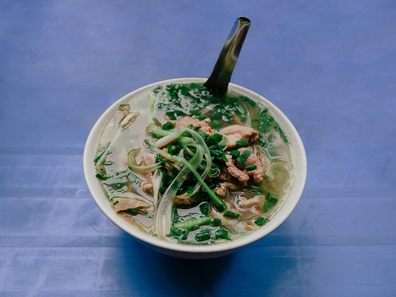 가게 앞은 명성에 걸맞게 기다리는 사람들과 주차된 오토바이들로 발 디딜 틈 없다. 터무니없이 작은 간판임에도 이런 북적이는 모습으로 쉽게 찾아갈 수 있다. 줄을 서서 주문과 계산을 하고 그릇을 받아 자리에 앉는 식인가 보다. 10분 정도 기다리니 내 차례가 온다. 요리가 만들어지는 과정이 가깝게 보인다. 백색면을 한 손에 잡아 넘겨주는 청년, 육수를 퍼담는 아저씨와 고기를 담당하는 주인아저씨와 아주머니. 아무렇게나 걸어놓은 듯한 많은 고기들이 어디에도 볼 수 없었던 진풍경을 만든다! 1 Pho Tai Nam을 외치면서 50,000동을 건넨다. 곧 넘칠 만큼 푸짐하게 담긴 소고기 칼국수 Pho Bo 가 나온다. 그릇을 받아 들고 밖이 보이는 빈자리에 앉는다.