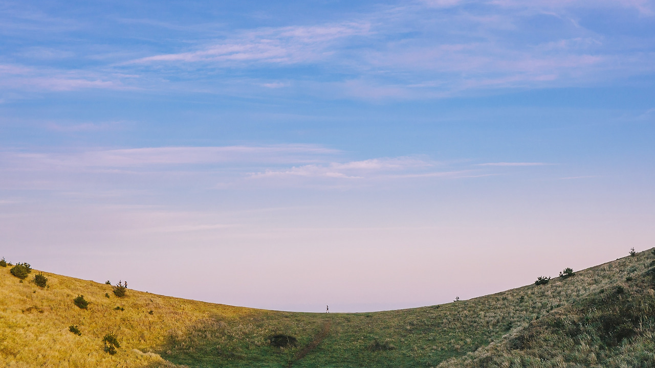 자유롭게 풀을 뜯고 있는 말들과 언덕 위의 실루엣들.