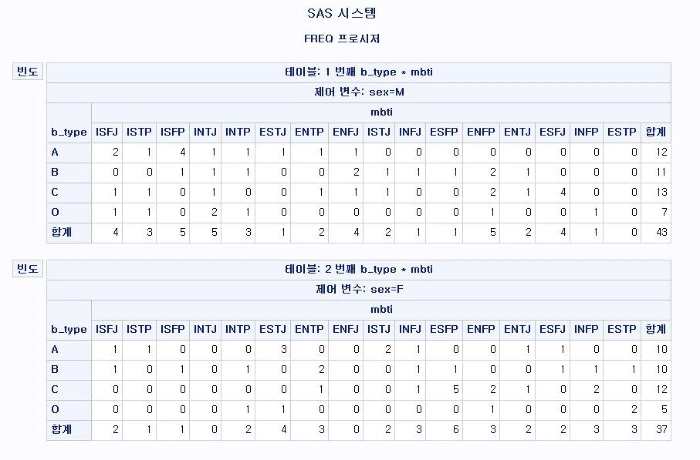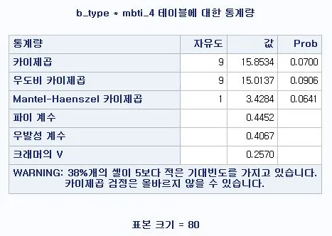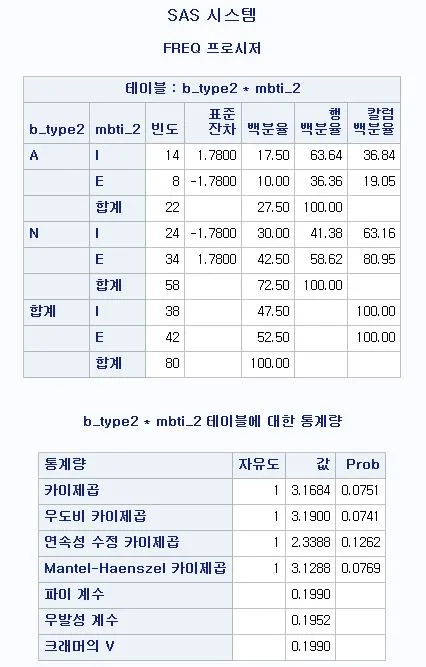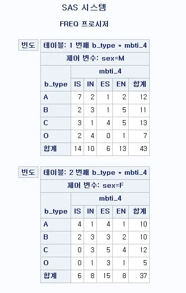 하지만 나는 이 결과 보다는 뒤에 언급할 결과가 더 타당한 해석이라고 본다. 우선, 표집된 데이터셋에서 성비와 혈액형 비율이 모두 한국 평균과 비슷했기 때문에 표본이 어느 한 부분에 편중되었다고 보기엔 어렵다고 생각하기 때문이다. 또한 설문을 작성한 개개인의 혈액형과 MBTI검사결과는 특정한 상관성을 가진다고 보기 어려우므로 독립성 또한 만족한다고 볼 수 있기 때문이다.