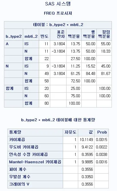 수정잔차를 살펴보니 혈액형 A형, MBTI결과 IS인 셀의 수정잔차의 절댓값이 3.1804로 매우 큰 것을 알 수 있었다. AB형, IS인 셀의 수정잔차의 절댓값 또한 1.8104로 높은 편이었지만, 이 두 셀을 제외하고 나머지 셀들은 평범한 수준의 잔차를 보였다. 또한 통상적으로 수정잔차가 2-3이상일 경우 독립성이 깨진다고 판단하기 때문에 AB형, IS인 셀의 경우 둘 사이에 상관관계가 성립한다고 보기는 어려웠다.