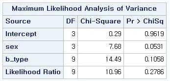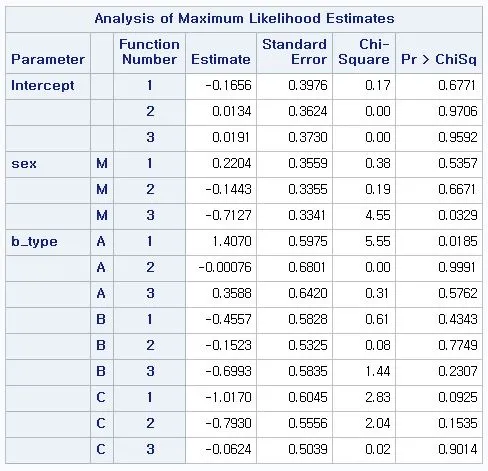 95% 유의수준 하에서 성별의 경우 p-value는 0.0531로 한계적으로 유의했으며, 혈액형의 경우 p-value는 0.1058로 유의하지 못했다. LR Stat.의 p-value는 0.2786으로 해당 모델이 적합하다는 귀무가설을 기각하지 못했다. 즉, MBTI로 나타난 성격유형에 성별과 혈액형 모두 유의한 영향을 준다고 할 수 없었다. 성별의 경우 한계적으로 유의했으나, 이 분석의 목적은 혈액형과 성격유형 사이의 상관관계를 알아보기 위한 것이었으므로 성별에 대한 추가적인 분석을 실시하지는 않았다. 혈액형의 경우에도 p-value가 아주 높은 편은 아니였기에 다른 통계량들을 살펴보았다.