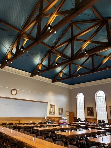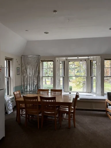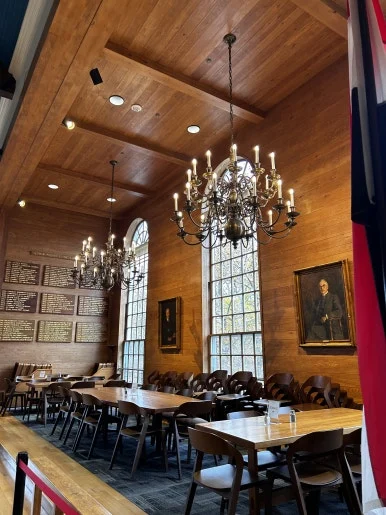 다음은 그로튼 학생들과 교직원들이 브런치, 아침, 점심, 저녁 식사를 위해 찾는 그로튼 스쿨의 다이닝 홀을 둘러보았다. 고풍스러운 분위기의 높은 천장과 큰 창문들을 통해 햇살이 쏟아져 들어오는 아름다운 공간이다. 이 곳에서 학생들은 균형 잡힌 맛있는 식사와 함께 풍성한 대화를 나누며, 몸과 마음의 건강을 함께 챙긴다.