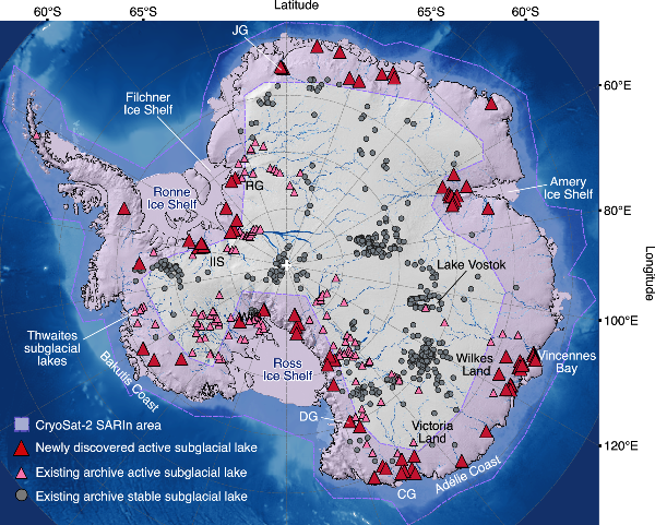 그 물이 고여 만들어진 곳을 빙저호(subglacial lake)라 부른다. 남극의 보스토크 호처럼 수십만 년 동안 외부와 단절된 호수도 있지만, 모든 빙저호가 고립된 것은 아니다. 얼음 밑에는 호수와 수로가 연결된 빙저 수계가 존재해, 물이 주기적으로 이동한다. 어떤 곳에서는 이 흐름이 멈추지 않아, 수년마다 호수가 비워지고 다시 차오른다. 이때 표면의 높낮이가 수 미터씩 오르내리는 모습이 인공위성에서도 관측된다. 이렇게 확인된 활동성 빙저호가 남극에만 230개가 넘고, 새로 발견되고 있다.