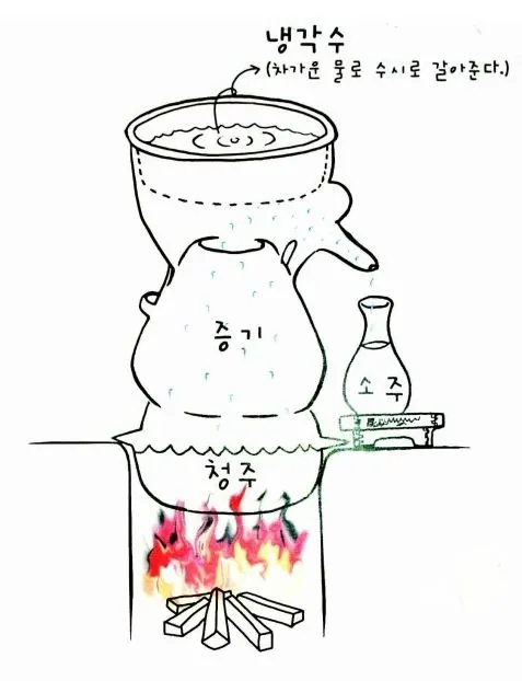 현재는 위스키 증류기와 같은 동증류기를 사용하지만 과거엔 소줏고리라고 하는 항아리에 술을 증류하였다.