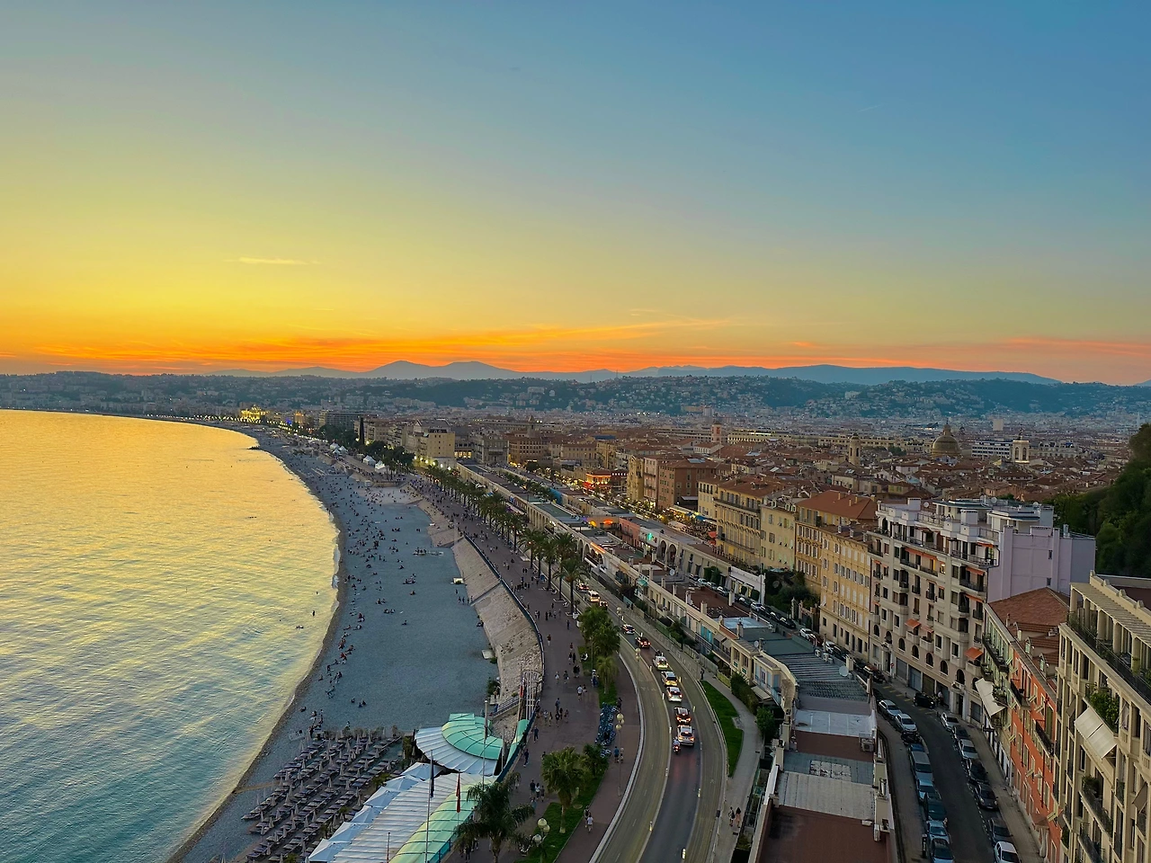 해변 길을 걷고 걸어 어느덧 포토 스팟에 다다랐다. I LOVE NICE는 못 참지~ 니스에 왔으니 기념사진을 서둘러 찍고 캐슬힐(니스 전망대)에 올라갔다. 20분 정도를 헥헥거리며 올라가니 니스의 멋진 전경을 한눈에 볼 수 있었다. 8시가 조금 넘은 시간임에도 불구하고 아직 해가 지는 중이었고 심지어 버스킹연주 덕분에 더 낭만이 가득해져 정말 행운이었다.(눈물 찔끔 난 건 안 비밀)