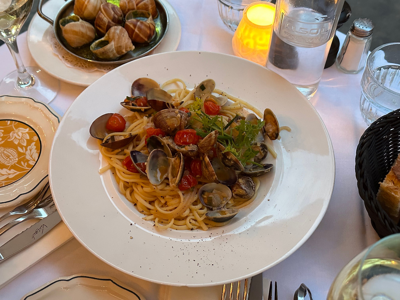 오르세미술관까지 소원성취한 이후, 또 엄청난 일정을 소화하고 걸었던 탓에 너덜너덜 해져서 저녁을 먹으러 갔다. 예히가 미술관 근처에 있는 르 앙티께르(Les Antiquaires)라는 식당을 찾고 바로 예약을 했는데, 알고 보니 꽤 유명한 맛집이었다. 운 좋게 야외에 자리를 잡고 봉골레파스타와 에스까르고, 추천받은 화이트 와인도 같이 주문했다. 이래서 파리, 파리 하나보다 생각이 들 정도로 정말 맛있게 먹었다. 그리고 이때를 기점으로 나는 레드 와인보다 화이트 와인을 더 선호하게 되었다.