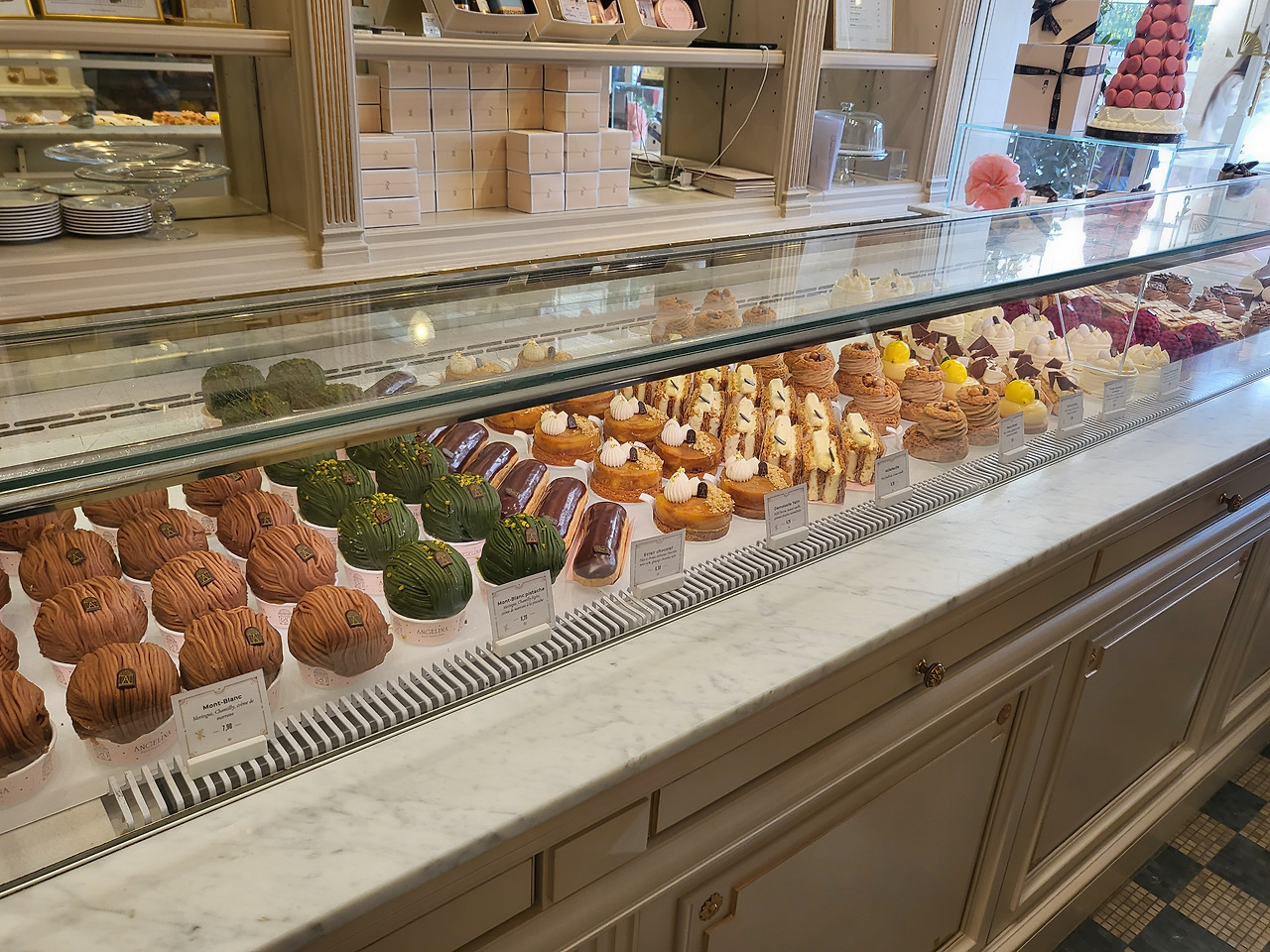 정신을 겨우 붙잡고 마레지구에서 루브르박물관 쪽으로 이동을 했다. 지하철에서 내리자마자 Since 1903, 100년 넘은 역사를 자랑하는 안젤리나(Angelina)에 먼저 발걸음을 옮겼다. 이미 웨이팅으로 소문이 자자해서 애당초 안에서 먹는 건 생각도 안 했지만 도착하자마자 보이는 긴 대기줄을 보고 바로 지체할 새도 없이 to-go로 바로 들어갔다. 쇼콜라쇼, 몽블랑 외 초콜릿 같은 디저트 종류도 많아서 고민하다가 밀푀유와 몽블랑 하나씩을 주문하고 선물용으로 밤잼과 크리스피 크레페도 함께 구매했다.