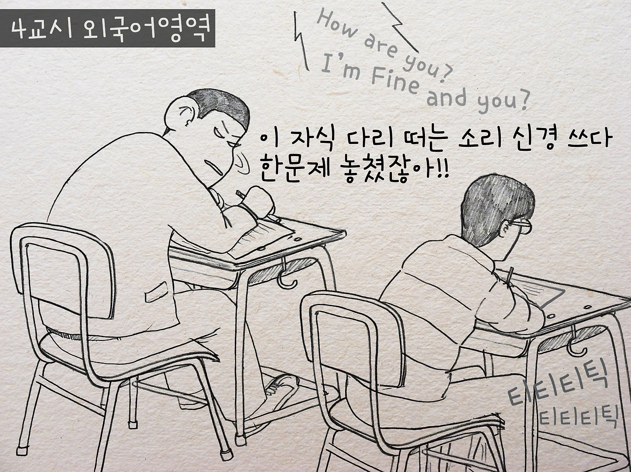 옆에 앉은 다른 학교 수험생이 다리를 계속 떠는 걸 '하지 말라고' 말할까 말까 고민하다가 한문제를 놓쳤다. 에잇