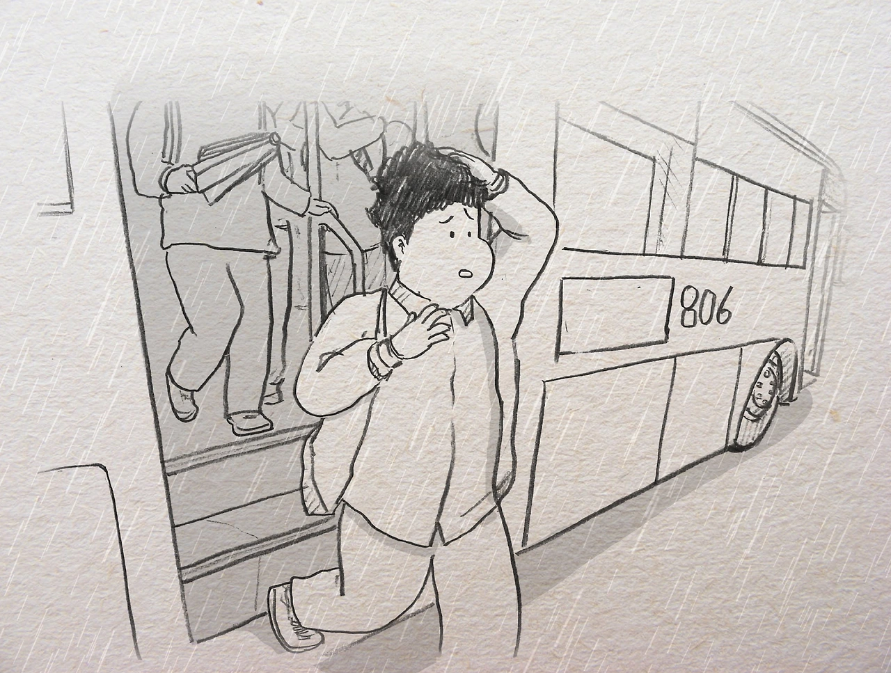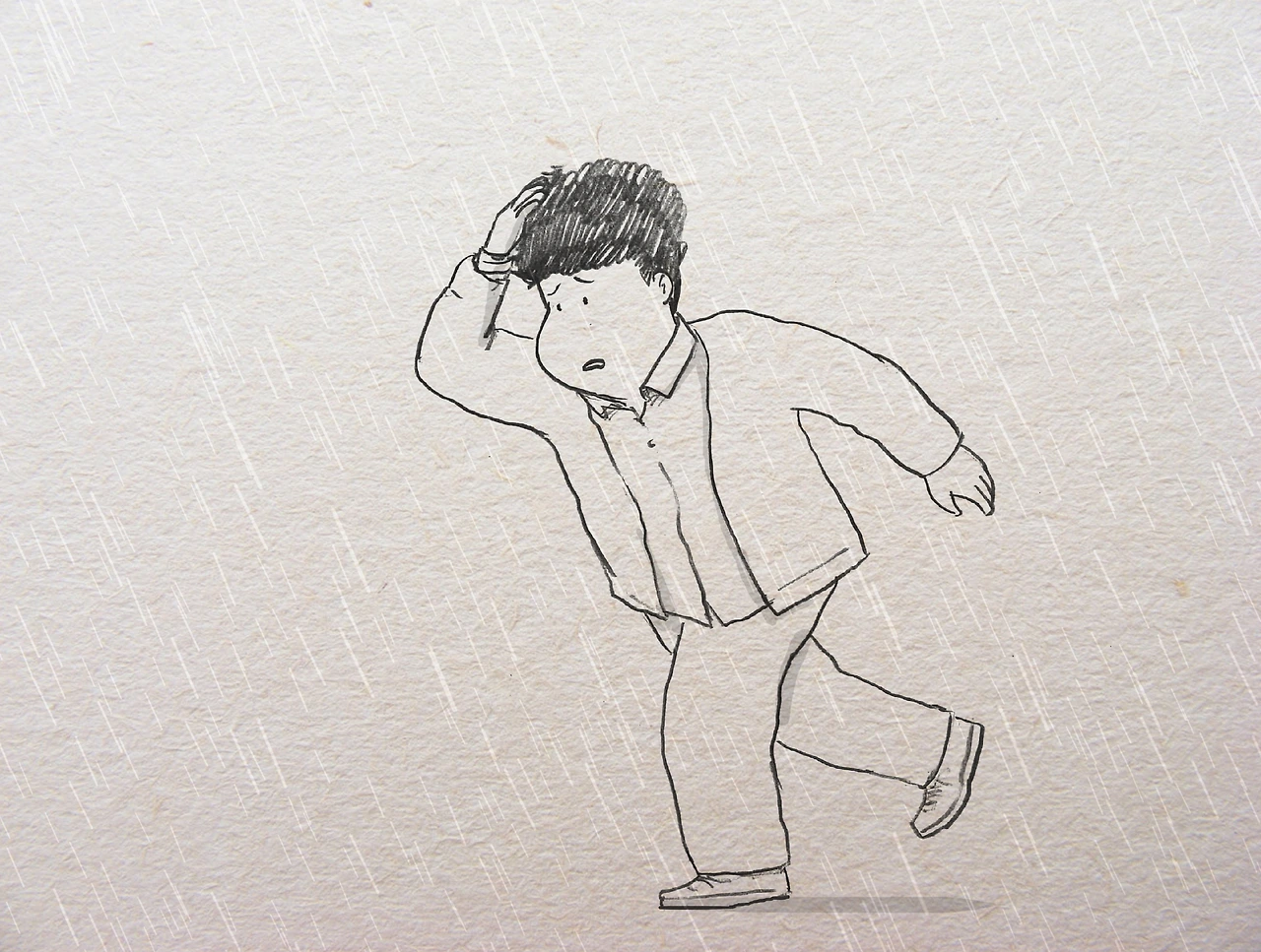 약속 장소로 출발할 땐 날씨가 맑았는데, 도착할 때 갑자기 비가 내리기 시작했다.