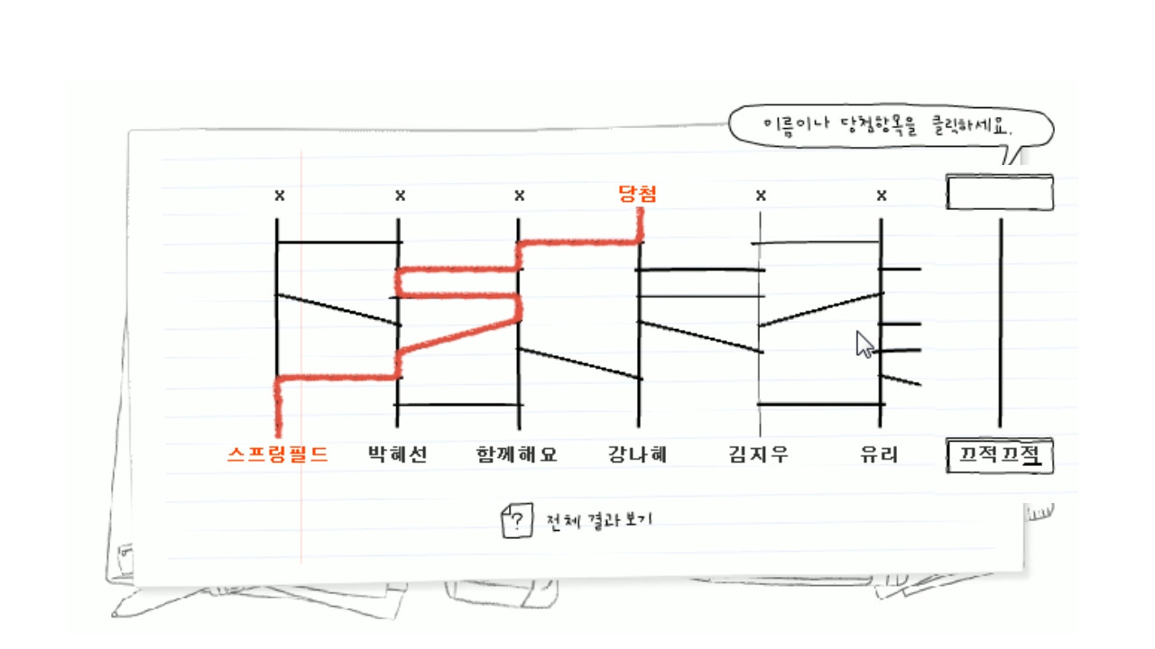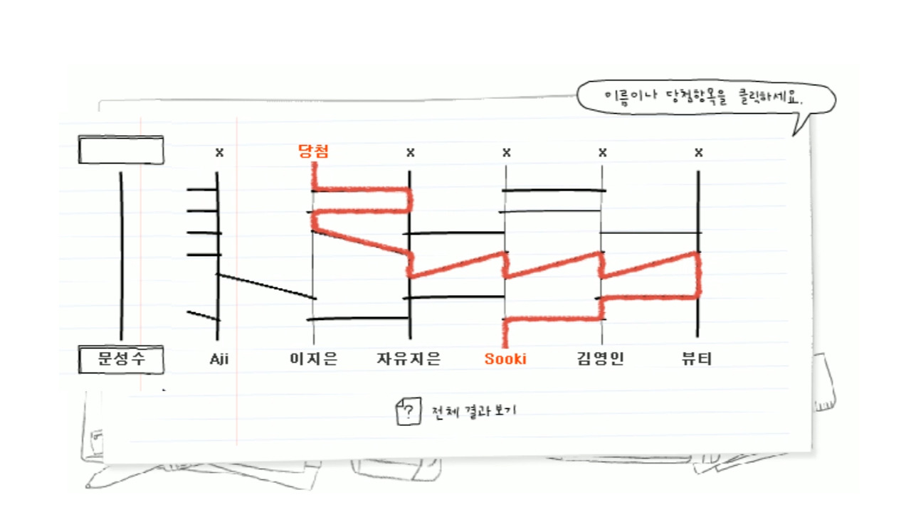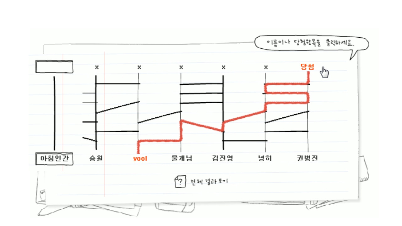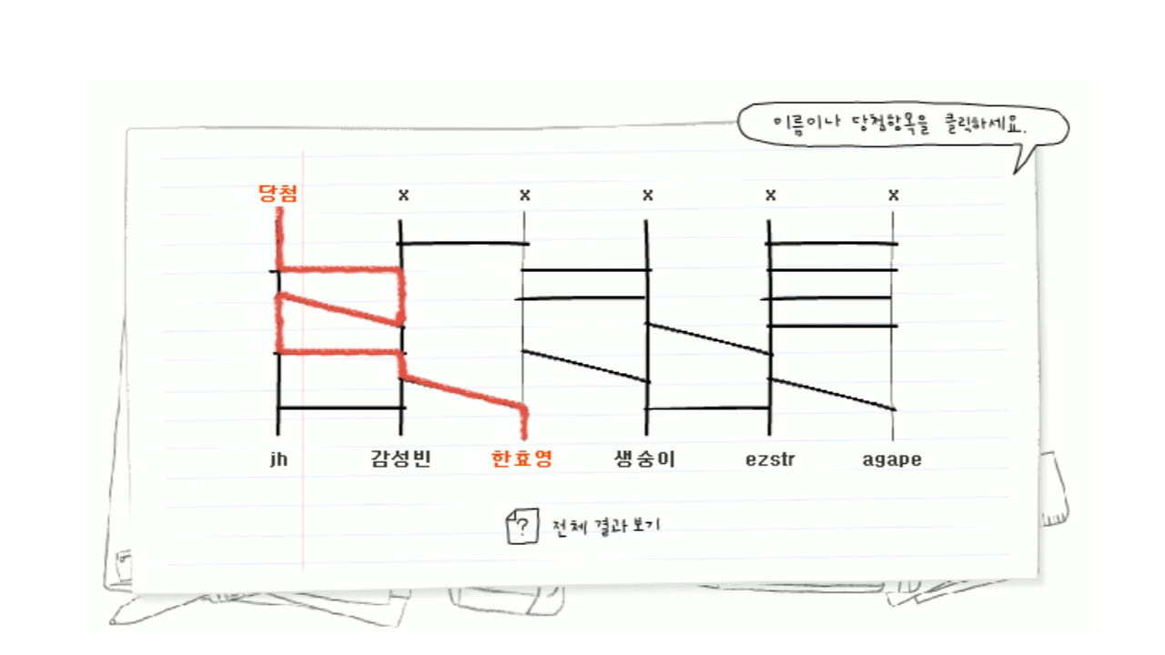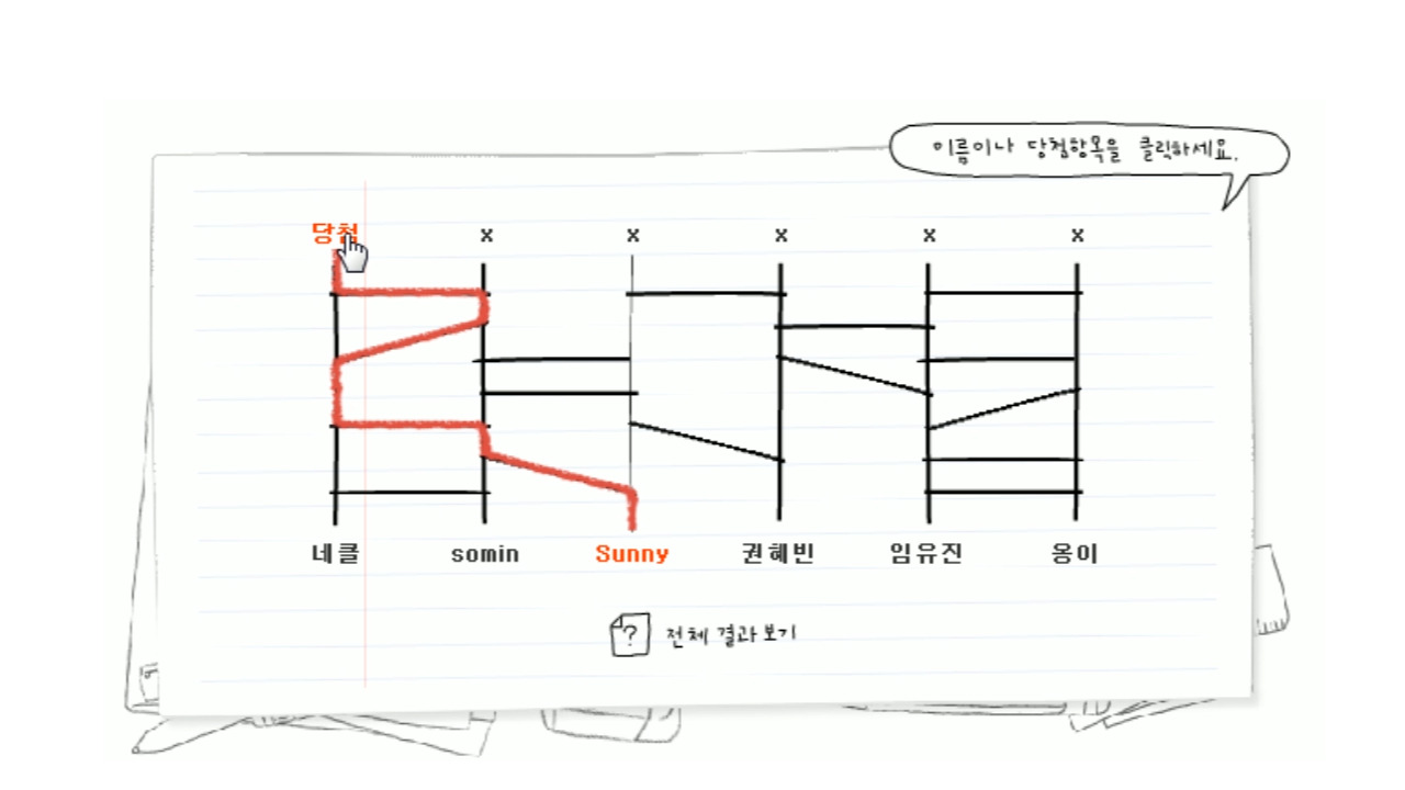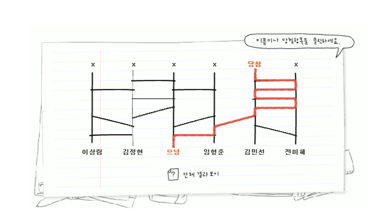 총 81명 중 18명 제외, 후보 63분을 순서대로 10번에 걸쳐 사다리 타기를 하였습니다.