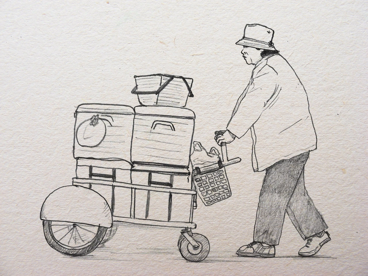 오전엔 가득 싣고 나온 수레가 무거워 발걸음이 힘겹고, 오후엔 한나절 피로가 눌려 담긴 발이 무거워 수레에 의지해 걷곤 하셨으리라. 손님 없는 거리에서 밀고 가던 삶의 무게가 입꼬리를 눌러 무표정하게 지나다니셨다.