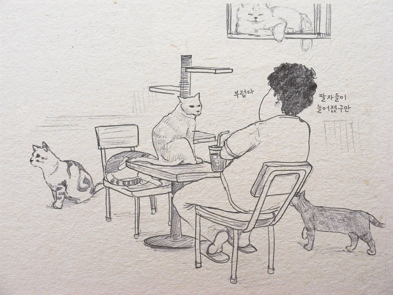 고양이 카페에 앉아 가만히 이 녀석들 지켜보다 보니. 뭐 특별히 하는 것도 없이 때 되면 주는 밥 먹고, 놀고 싶은 대로 놀다가 졸리면 늘어지게 자도, 누구 하나 구박하지 않고 예뻐해 주기만 하는 게 '아 고양이 팔자 참 좋구나' 싶더라.