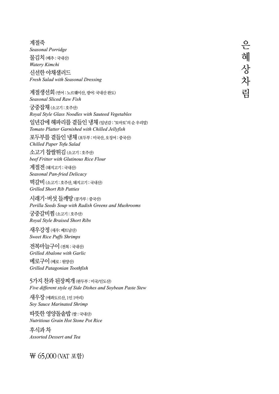 본가 가족들하고 식사할 일이 생겨 식당을 알아보던 중에, 예전에 친척들하고 가족모임을 자주 하던 곳이 생각이 나서 초대한정식을 예약을 했다. 5명이서 식사하여 방으로 예약하였고, 6만 5천 원의 은혜상차림으로 먹었다. 2만 9천 원부터 6만 5천 원까지 다양한 금액대의 코스가 있다.