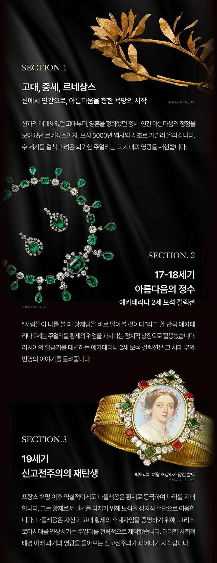 전시 시작은 고대, 중세, 르네상스 시대로 시작된다. 그러면서 예카테리나 2세들과 나폴레옹 등 왕족들과 귀족들의 화려한 장식들의 전시로 이어진다.