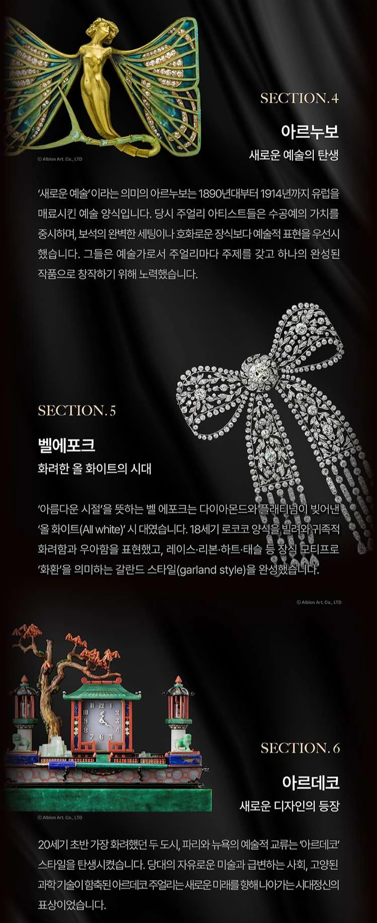 그 후에는 예술적 표현을 중시한 아르누보, 벨에포크 시대에 다이아몬드와 플래티넘으로 화한 형태로 만든 갈란드 스타일, 과학 기술이 함축된 화려한 아르데코 등 다양한 시대의 다양한 양식을 소개하고 있다.