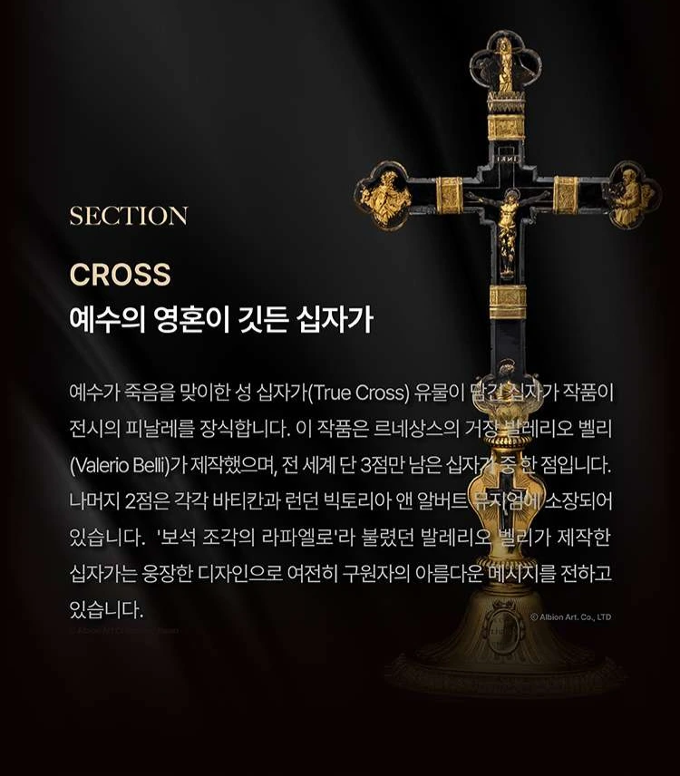 마지막에는 긴 검은 통로 끝에 무언가가 보인다. 예수가 죽음을 맞이한 성 십자가의 유물이 담긴, 르네상스의 거장 발레리오 벨리(Valerio Belli)가 제작한 십자가이다. 전 세계에 3점만 남아 있으며, 나머지 2점은 바티칸과 런던 빅토리아 앤 알버트 뮤지엄에 소장되어 있다. 가운데 예수와 함께 4 복음서의 저자인 마태(천사), 마가(사자), 누가(소), 요한(독수리)도 같이 표현되어 있다. 딱 봤을 때, 기대했던 감동은 크게 오지 않았다. 그렇게 보고 나오면 전시 입장했던 곳으로 바로 나오게 된다.