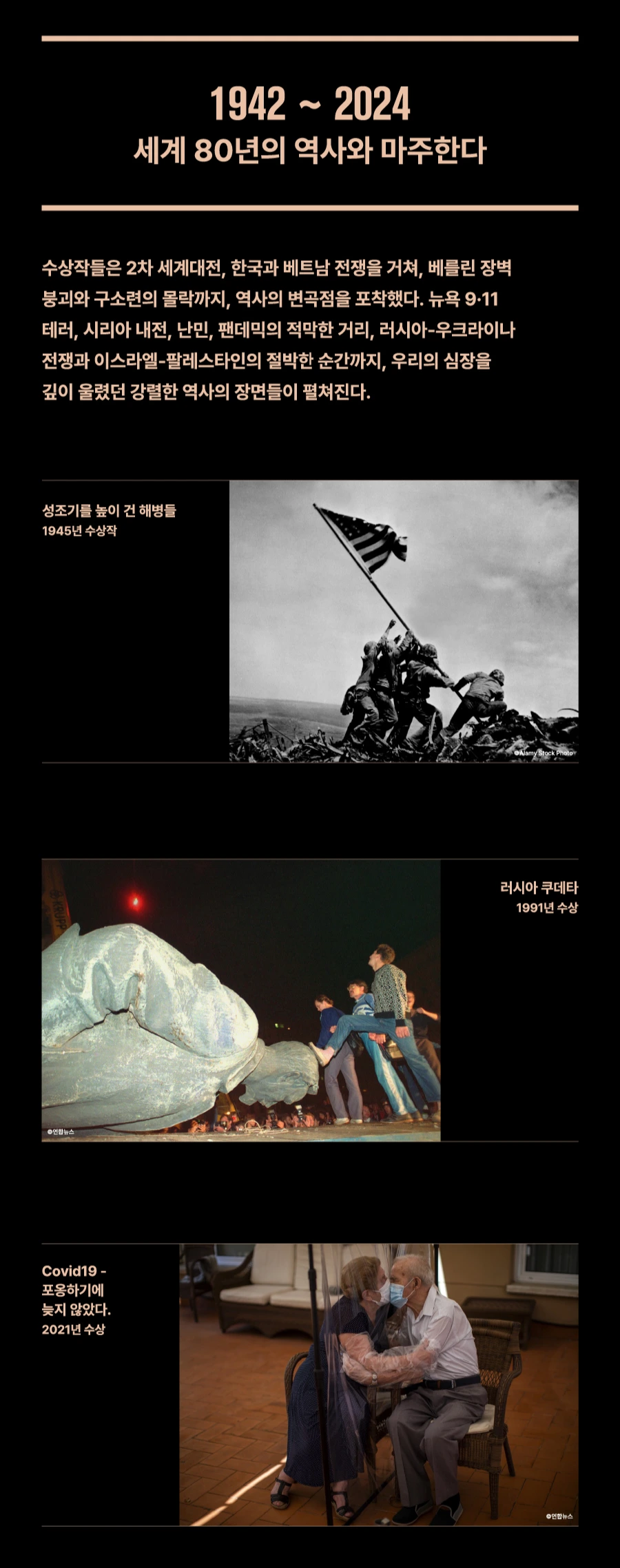 사진전이다 보니 내부 사진 촬영은 금지되어 있었다. 그러나 워낙 유명한 사진들이 많아 한번쯤 본 사진들도 많았다. 사진 옆에는 당시 전후의 상황들의 대한 묘사도 적혀있어 사진의 생생함을 더 느낄 수 있었다. 사진들을 시대 순으로 나열되어 있었다.1942년 수상작부터 2024년까지의 역사적인 흐름 볼 수 있다. 많은 사진들은 여러 가지 역사적인 순간들, 특히 전쟁, 시위에 대한 사진들이 많았다. 세계 2차 대전, 베트남전쟁, 625 전쟁, 아프가니스탄전쟁... 그리고 인권운동의 현장들이나 자유를 위한 시위들에 대한 사진을 통해 강렬한 메시지가 전달되었다.