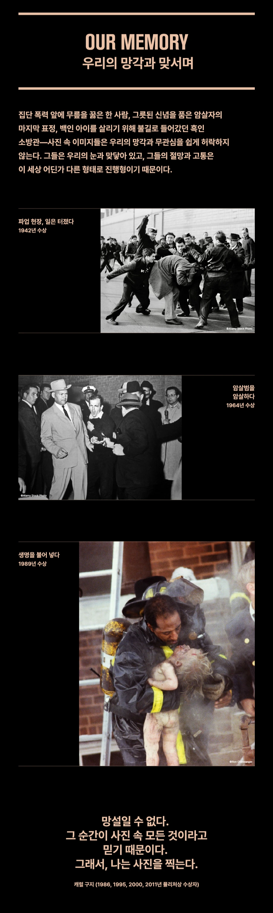 쭉 사진들을 살펴보니 대부분의 사진들이 우리가 어쩌면 살면서 한 번도 볼 수 없는 현장이지만, 지금도 지구 어딘가에서는 일어나고 있는 일들에 대한 사진들이었다. 내가 지금 이 순간 아무런 위협 없이 지낼 수 있는 것, 그것 또한 사치일 수 있겠구나 하는 생각과 이런 순간들을 오랜 시간 기억될 수 있게 해주는 사진의 힘을 느낄 수 있었다.
