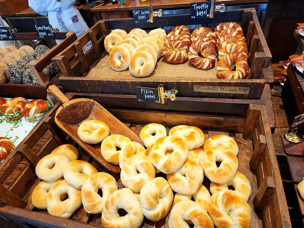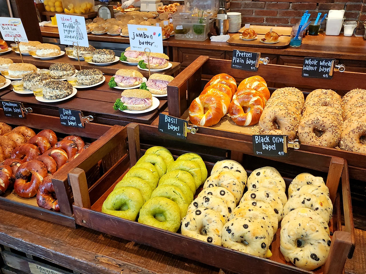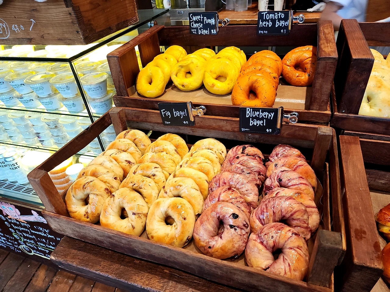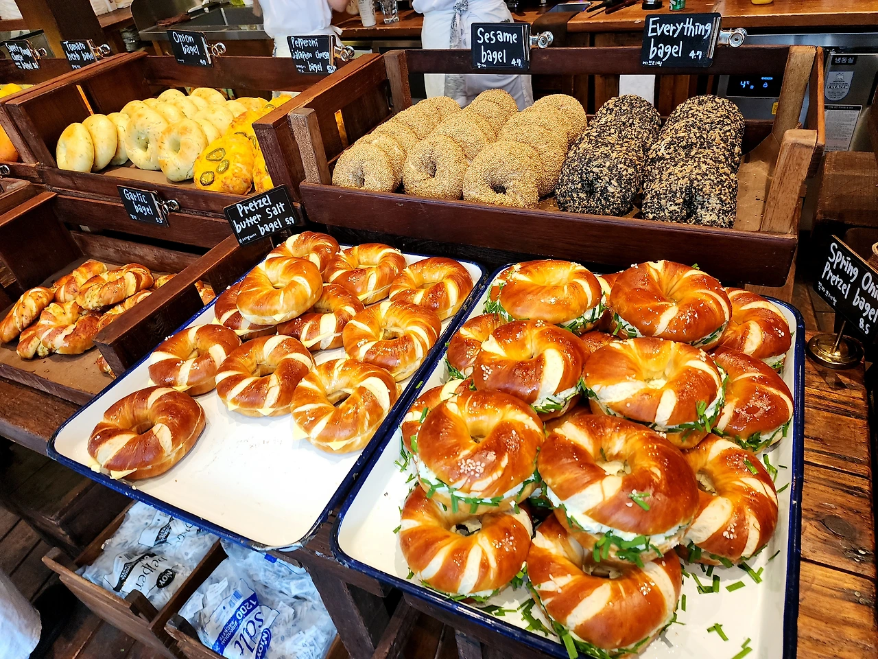 우리 차례가 되어 가계에 들어갔다. 직원이 엄청 엄청 많았고, 베이글을 공장처럼 찍어내는 듯했다. 자리는 하나의 긴 테이블이 있고 마주 보고 2명 단위로 앉는 구조였다. 굿즈 테이블을 지나서 포장하는 사람과 섞여서 줄을 서서 베이글을 걸어가면서 쟁반에 담고, 크림치즈를 담고 계산대로 이동하는 시스템이었다. 계산대에서는 먹고 가는지, 포장하는지 여부를 말씀드리고 기다리면 음식을 가져갈 수 있다. 우린 가장 맛나 보이는 베이글과 인기순위 10위안에 있는 크림치즈를 구입했다.