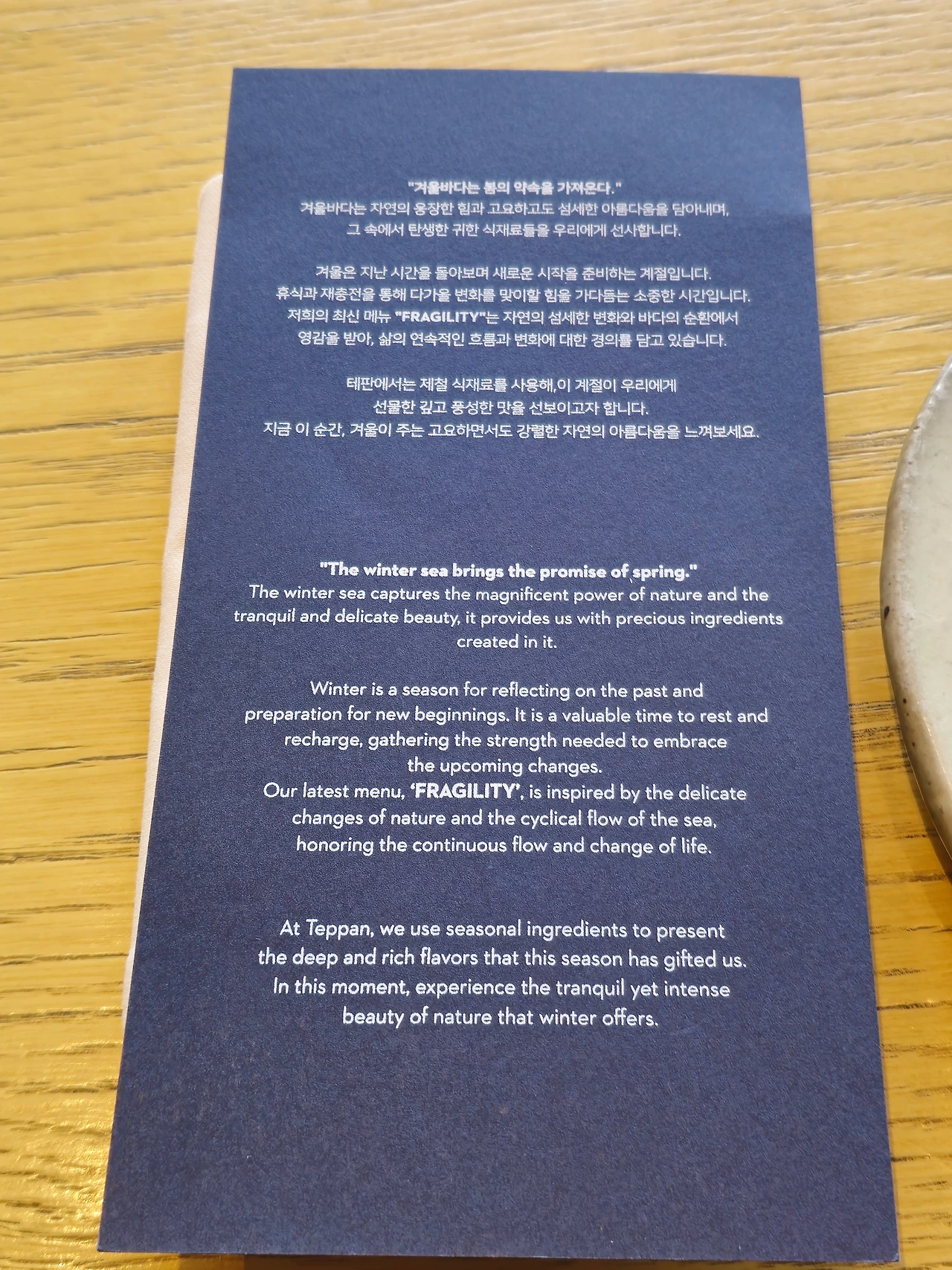 가족 기념일이 있어 구성원들과 함께 오랜만에 테판을 방문하고자 예약을 진행했다. 테판은 계절마다 제철 음식으로 메뉴를 바꾼다. 이번에도 2025년 3월 10일부터 봄 메뉴가 시작되는데, 우리는 매번 겨울 메뉴만 예약했던 것 같다. 생각날 때, 다른 계절들의 메뉴들도 꼭 한번 시도해 봐야겠다.