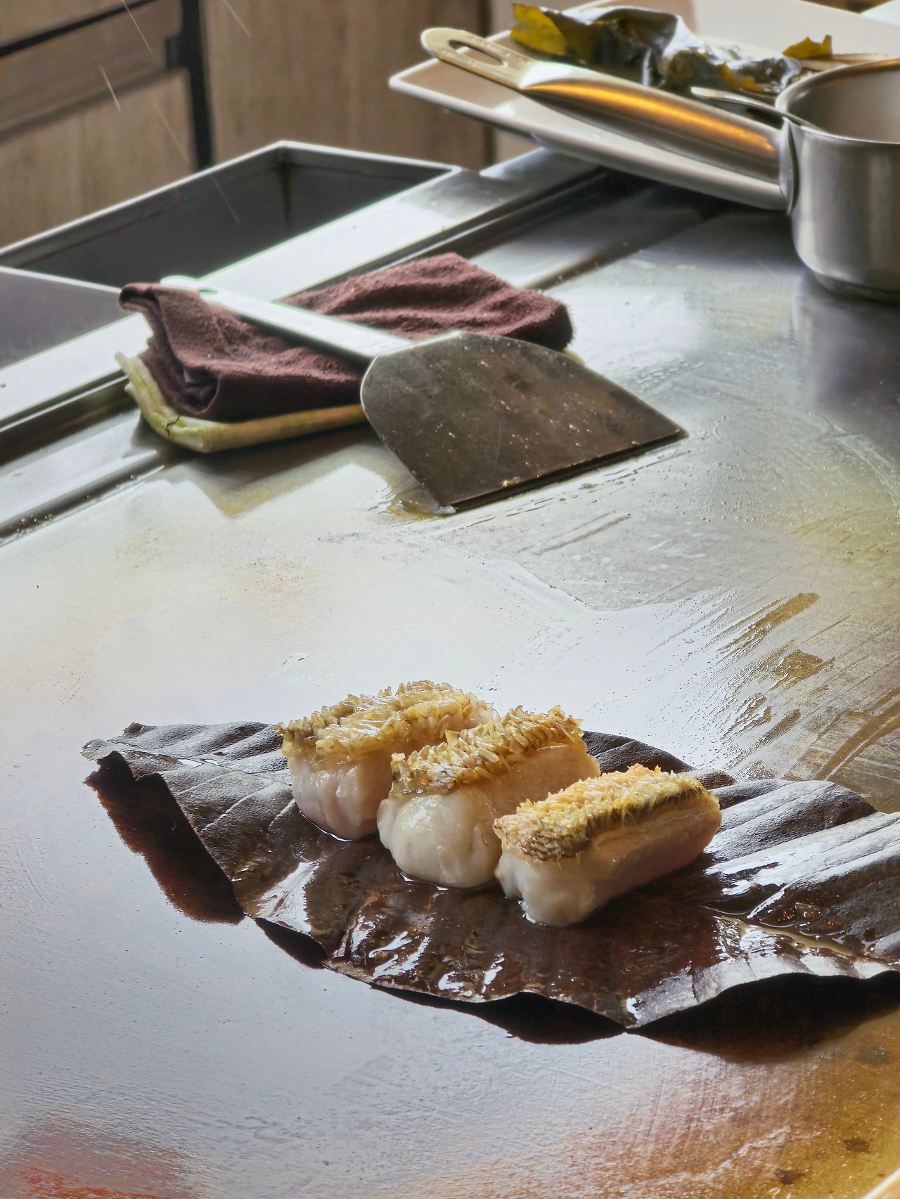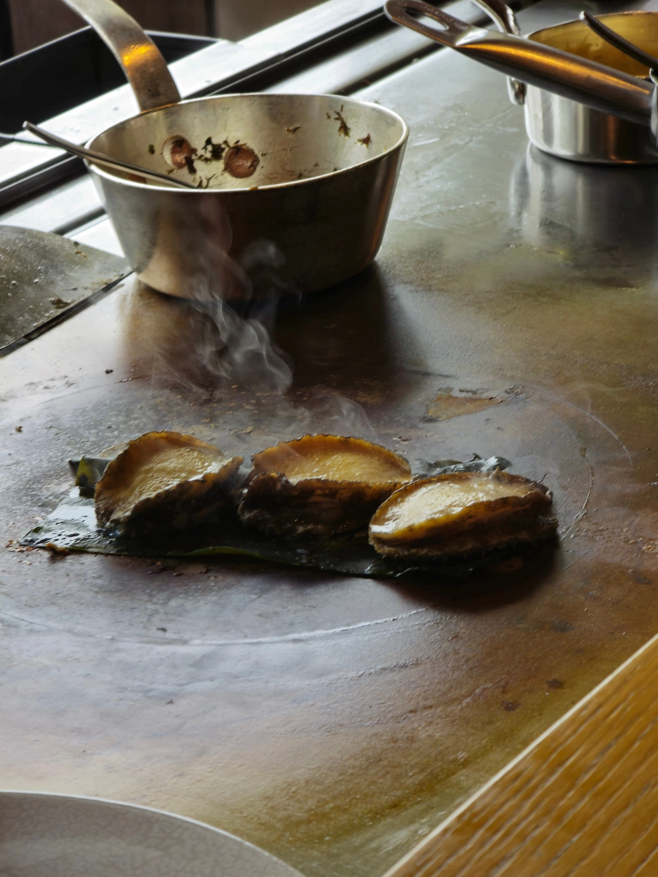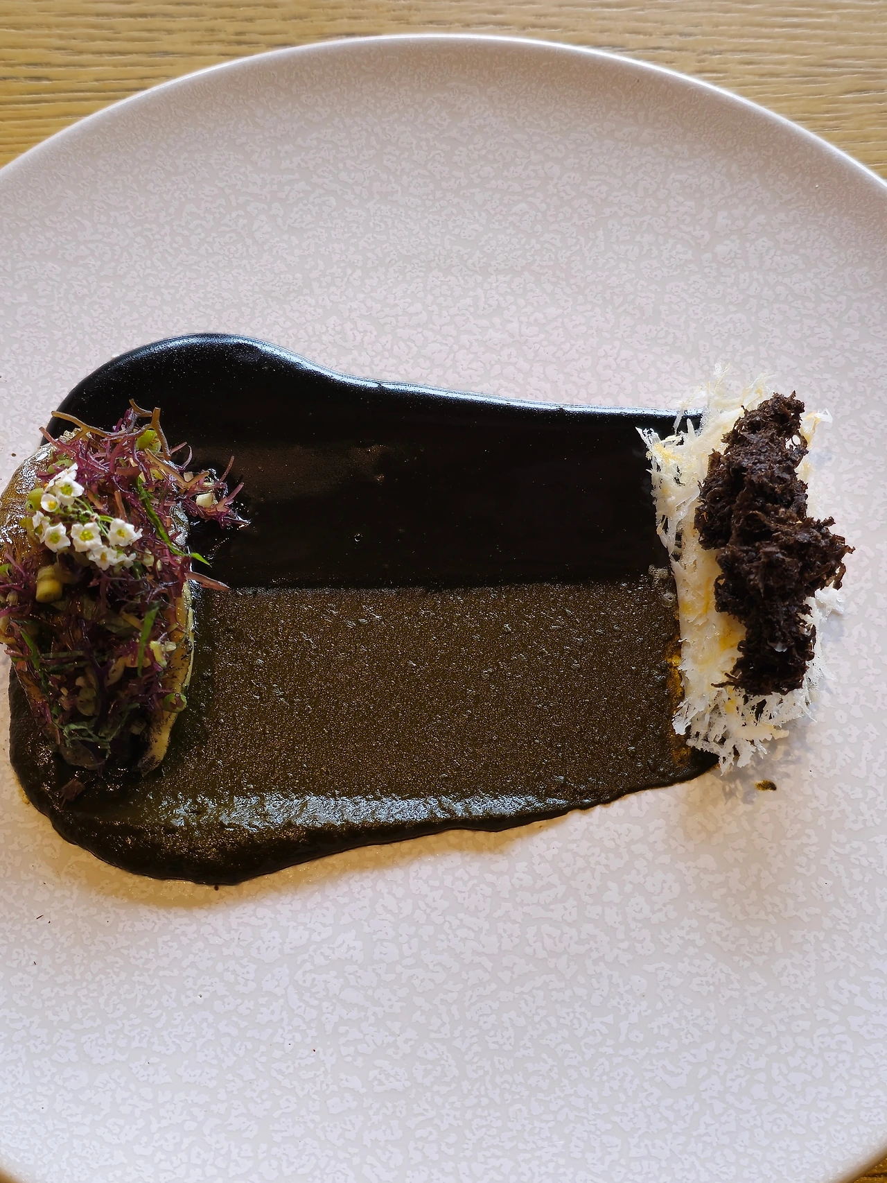 두 번째는 전복으로 준비되어 있었다. 새벽에 직접 배송받은 전복은 구울 때 다시마를 덮어서 철판 위에서 구워지게 되고 소스도 다시마로 만들었다. 김으로 만든 소스도 있는데 이는 전복의 주식이 바로 이러한 해초류라는 점에서 착안하여 조리법을 만드셨다고 하셨다. 위에는 고급 트러플에서 분류되는 겨울 트러플에 제공되었는데 생각하던 트러플 맛이 아니라 내 입맛에는 잘 맞진 않았다. 그릇 반대쪽에는 미몰레트 치즈에 싸인 고구마가 가니쉬로 올려져 있었다. 이 디쉬는 마치 검은 소스에서 필압이 느껴지는 한국의 수목화처럼 올려져 있었다.