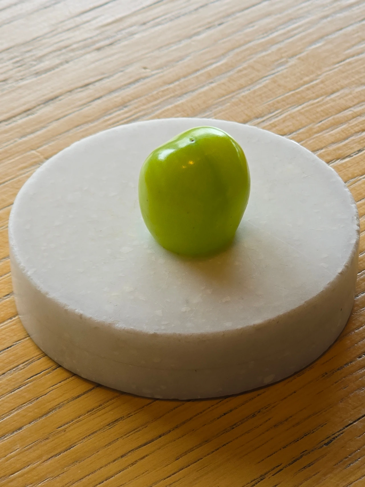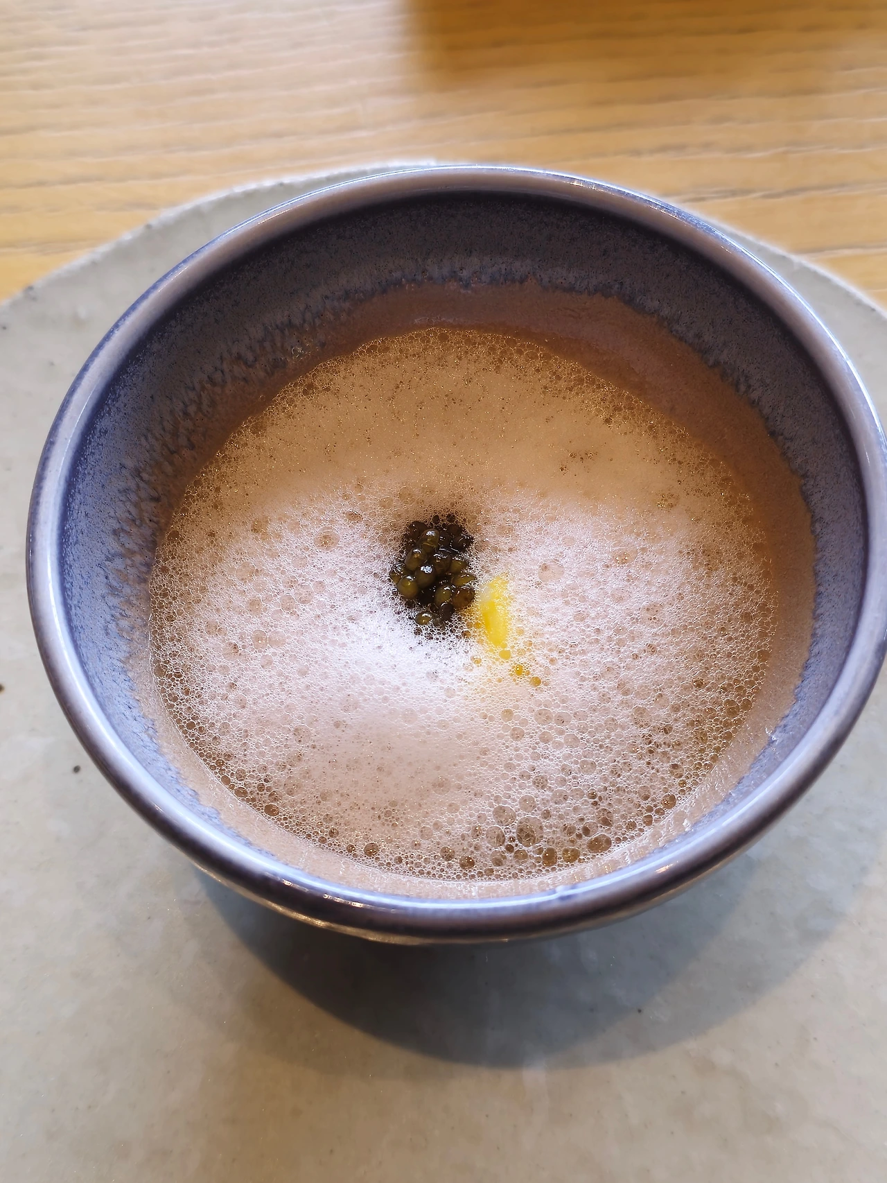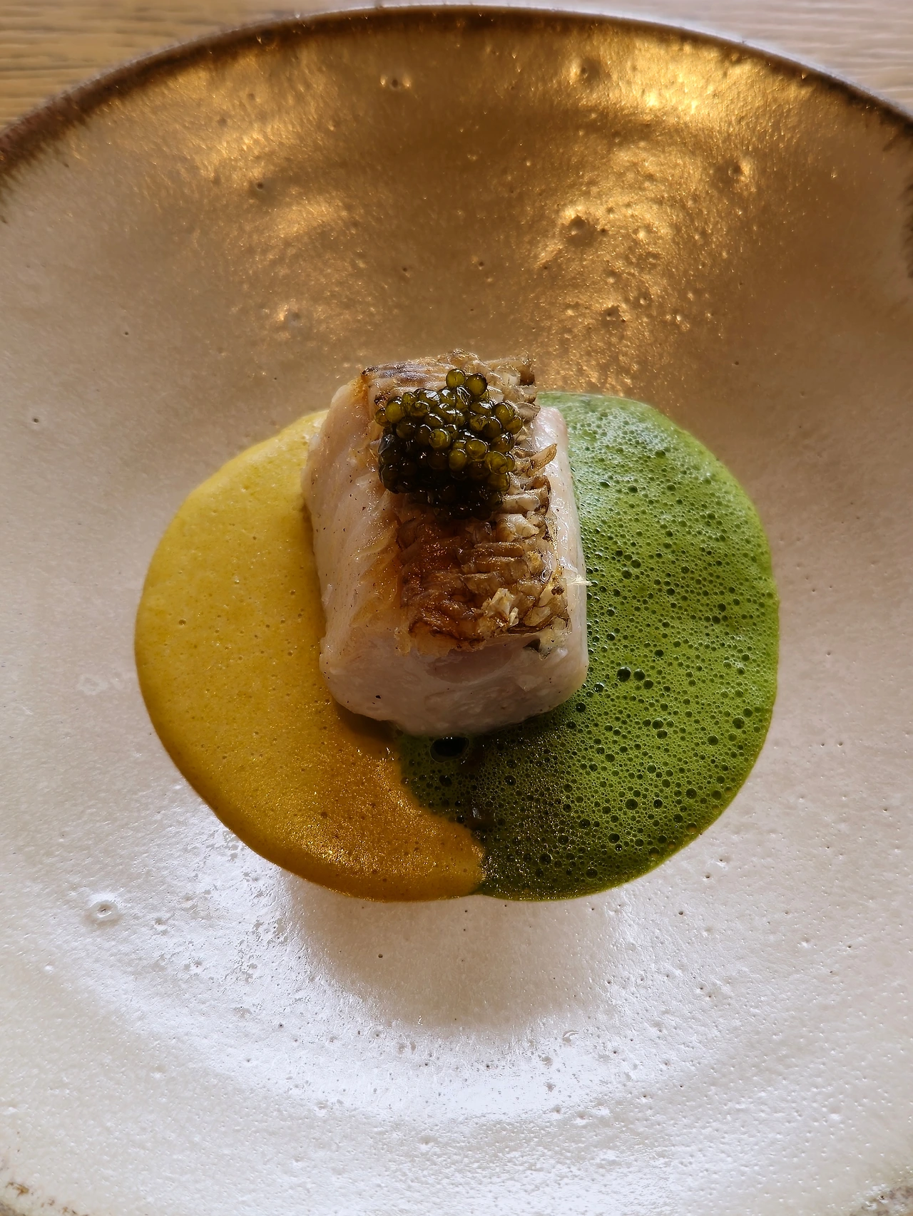 첫 번째 메뉴는 바로 옥돔이었다. 껍질의 바삭함과 살의 부드러움이 다 살아있었고, 각각 한쪽에 고사리와 고추냉이로 만든 소스를 거품기로 부드럽게 만들어 제공하였다. 위에는 칼루가 골드 캐비어가 올려져 있었다. 노랑과 초록의 사이에 있는 옥돔이 마치 로스코의 작품처럼 느껴졌다.