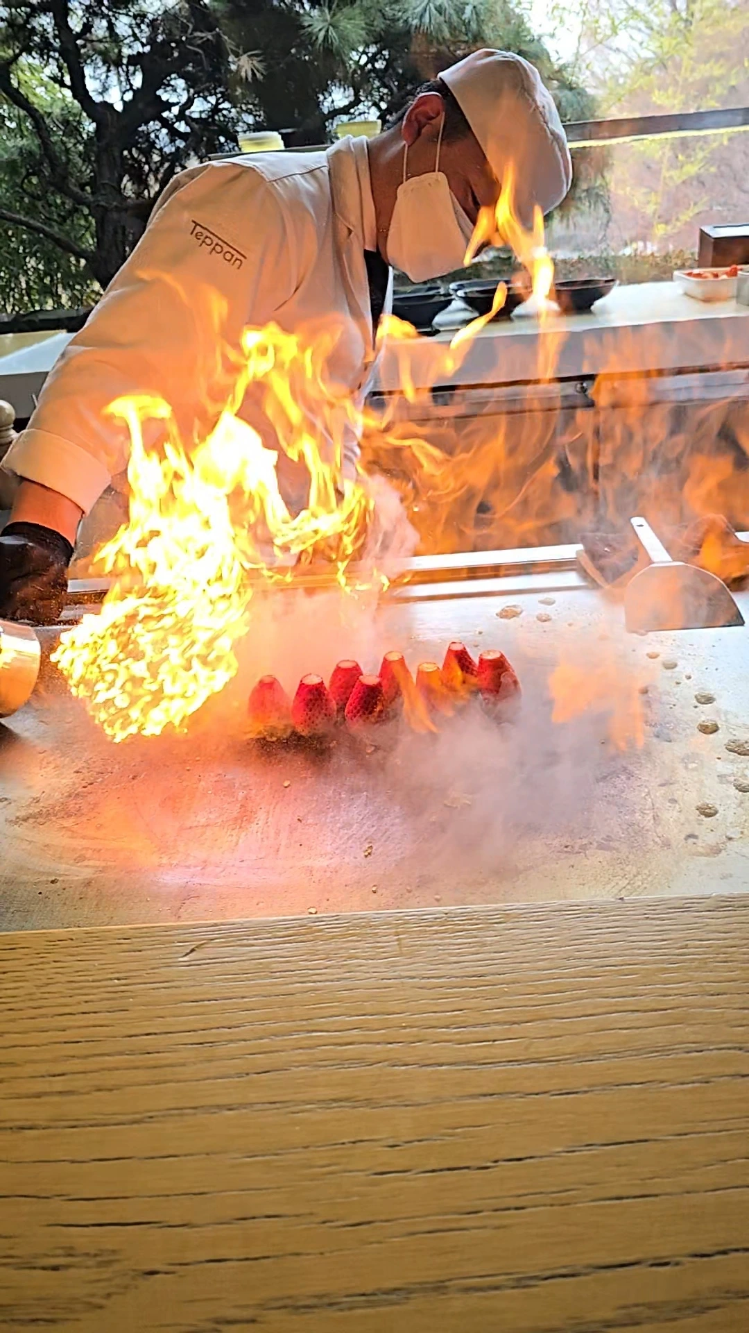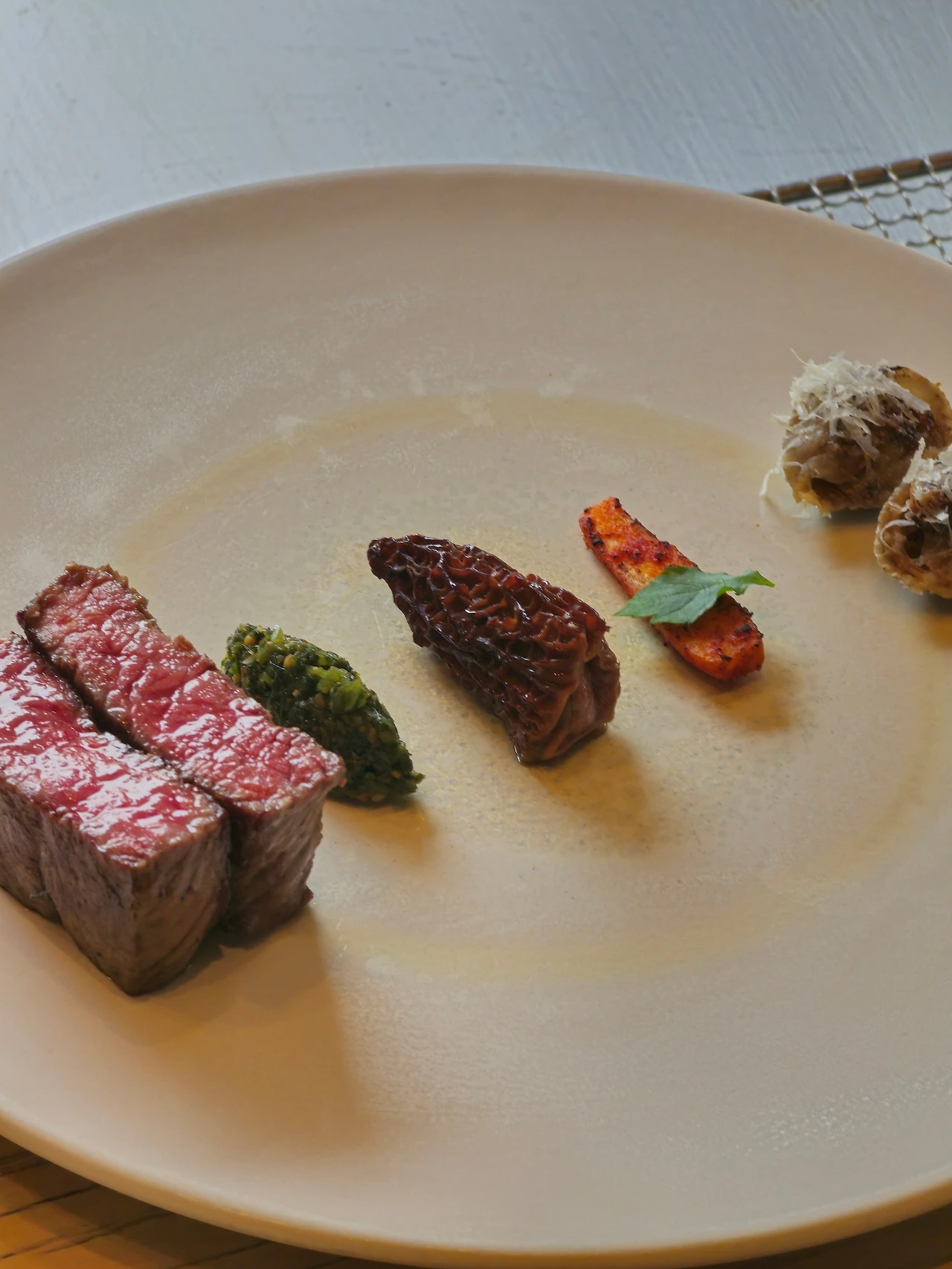 메인인 한우 스테이크가 준비되고 있다. 우선 굽기 전에 훈연을 먼저 하는 과정이 있는데 뒤에서 따로 하시기도 하는데 사진 촬영을 위해 식사 테이블 위에서도 보여주신다. 한우와 더불어서 참나물, 모렐버섯, 더덕, 꼬막까지 가지런하게 정갈히 제공된다. 특히 모렐버섯은 버섯 특유의 맛이 있어 트러플과 견줄만하다고 생각되었다.