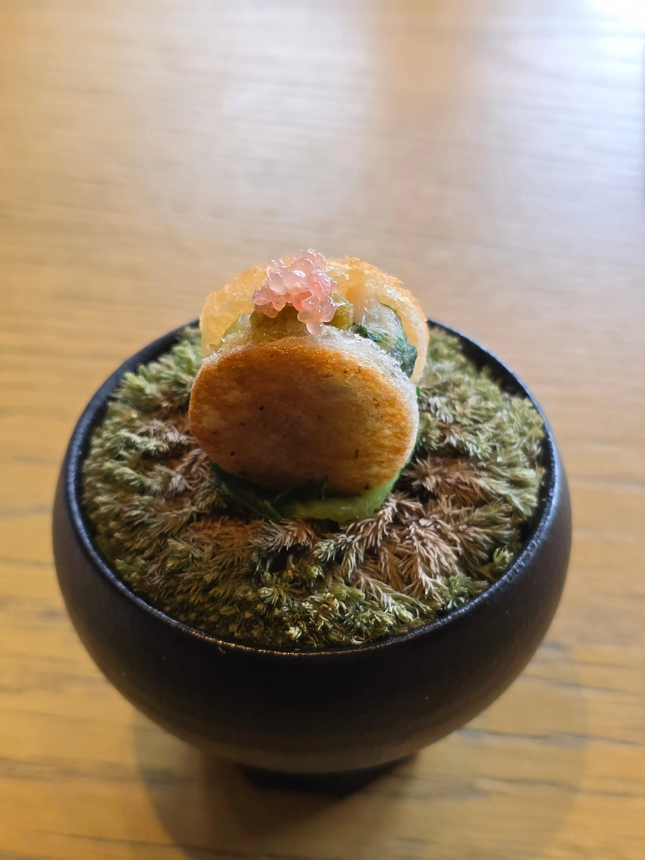 웰컴 바이츠는 총 2가지가 준비되어 있었다. 첫 번째는 단호박, 오징어, 캐비어가 올라간 수프였다. 단호박의 단맛과 해산물들의 짠맛으로 입맛을 돋웠다. 두 번째는 미니 새우토스트로 준비되었다. 멘보샤와 비슷한 느낌이지만, 제철인 냉이와 라임이 올라가서 향이 너무 좋았다.