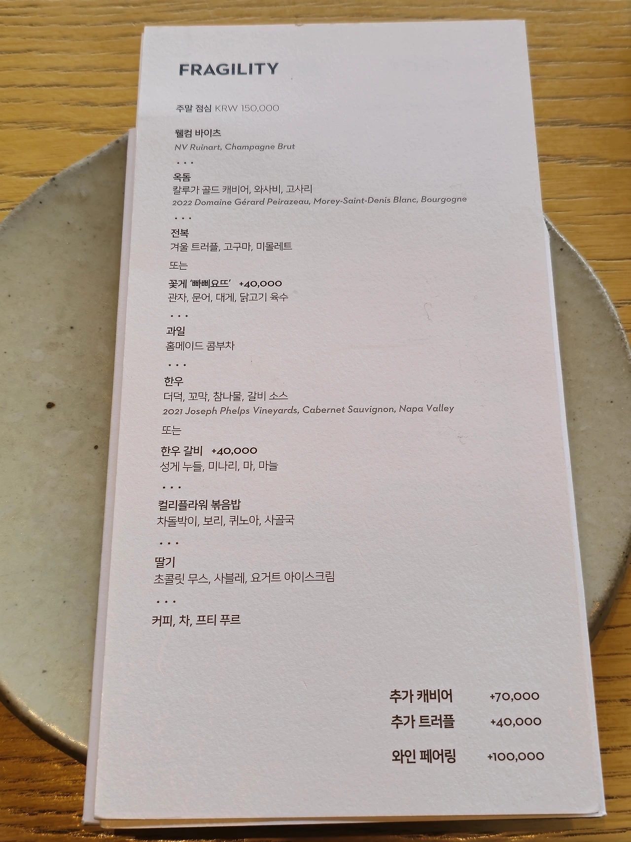 겨울의 콘셉트는 겨울바다의 'Fragility'로 진행되었다. 최근에 흑백요리사로 파인다이닝에서의 요리 과정 속 디테일들에 대한 배경지식이 조금은 생겼기에 저번보다 더 잘 즐길 준비가 되어있었다.