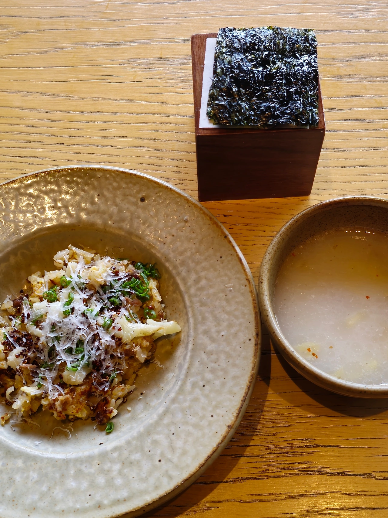 마지막은 볶음밥이었다. 컬리플라워, 보리, 퀴노아와 함께 차돌박이까지 들어간 볶음밥이다. 사골국과 구운 김도 제공되는데 각각 먹어도, 따로 먹어도 너무 맛있었다.