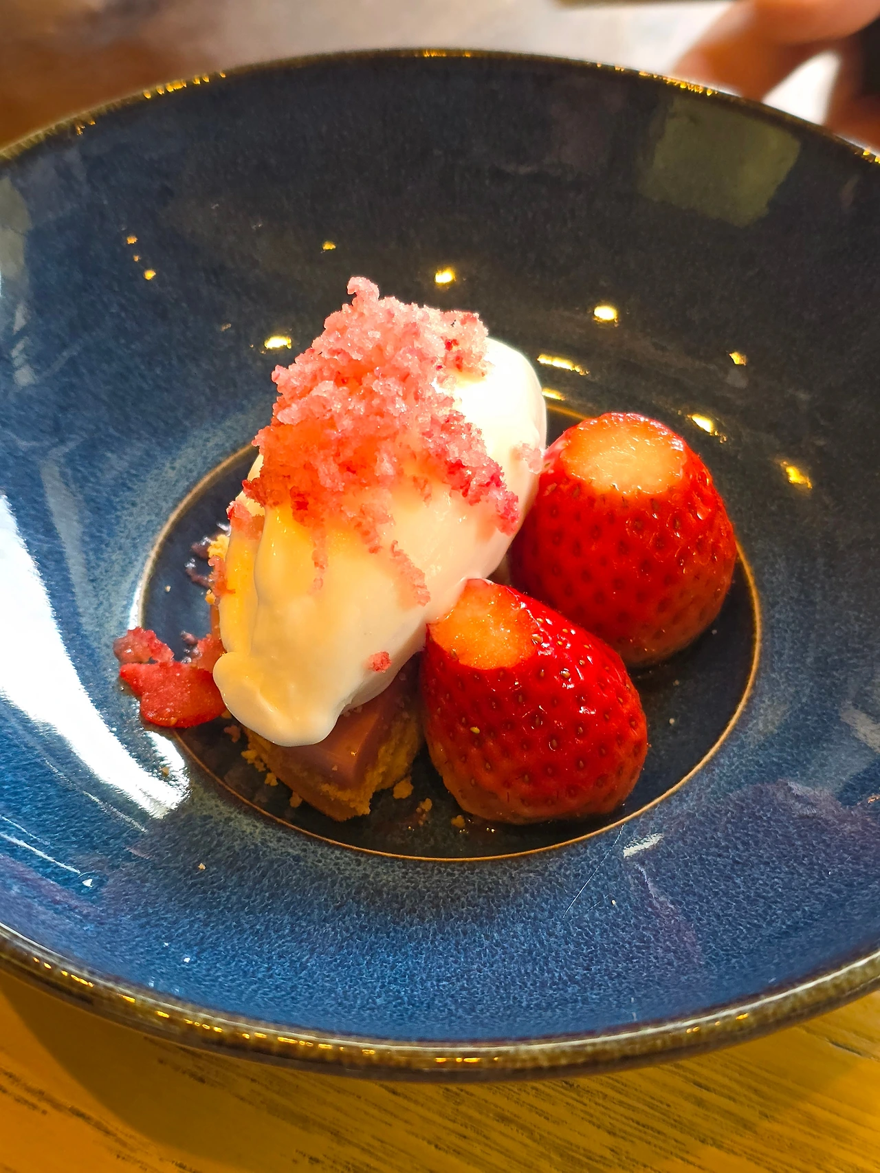 마지막 디저트는 겨울의 제철과일 딸기로 구성된 아이스크림이었다. 딸기와 함께 파이어쇼로 시작하여서 냉동 딸기를 한 번 더 갈아서 올려준다. 딸기 향으로 가득한 디저트였다.