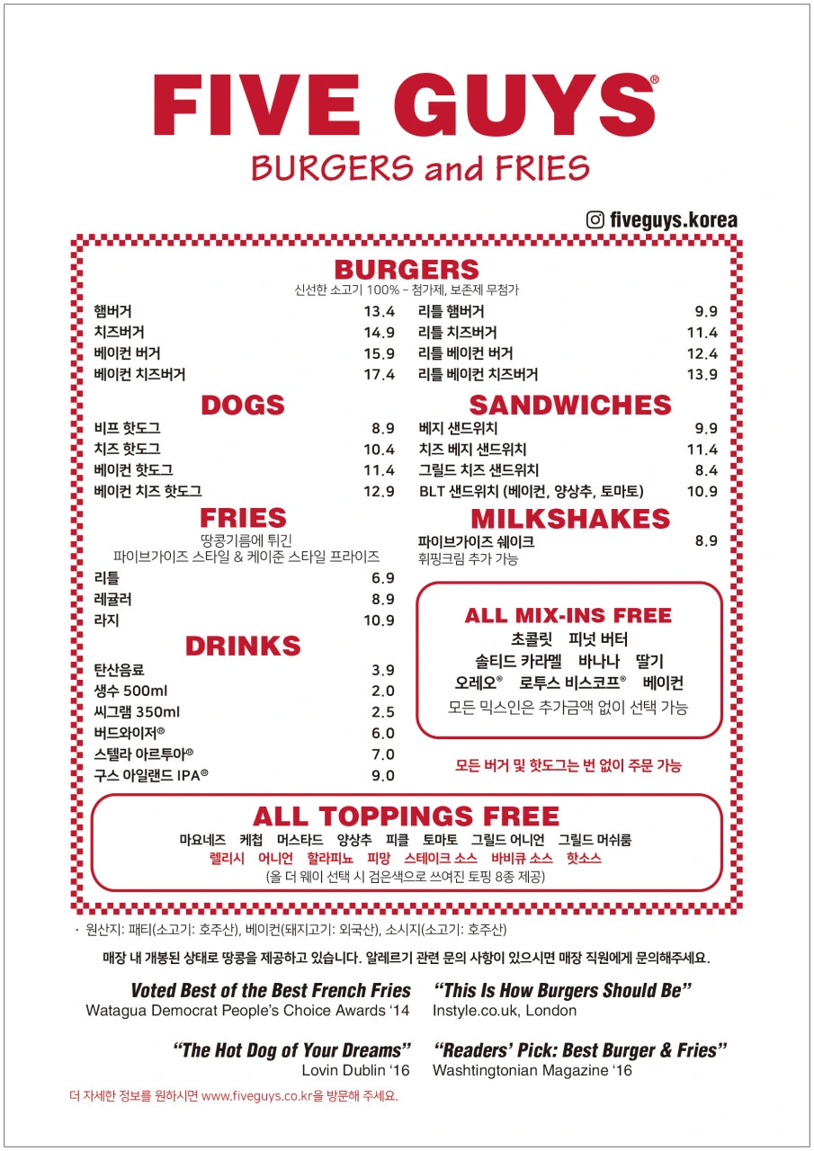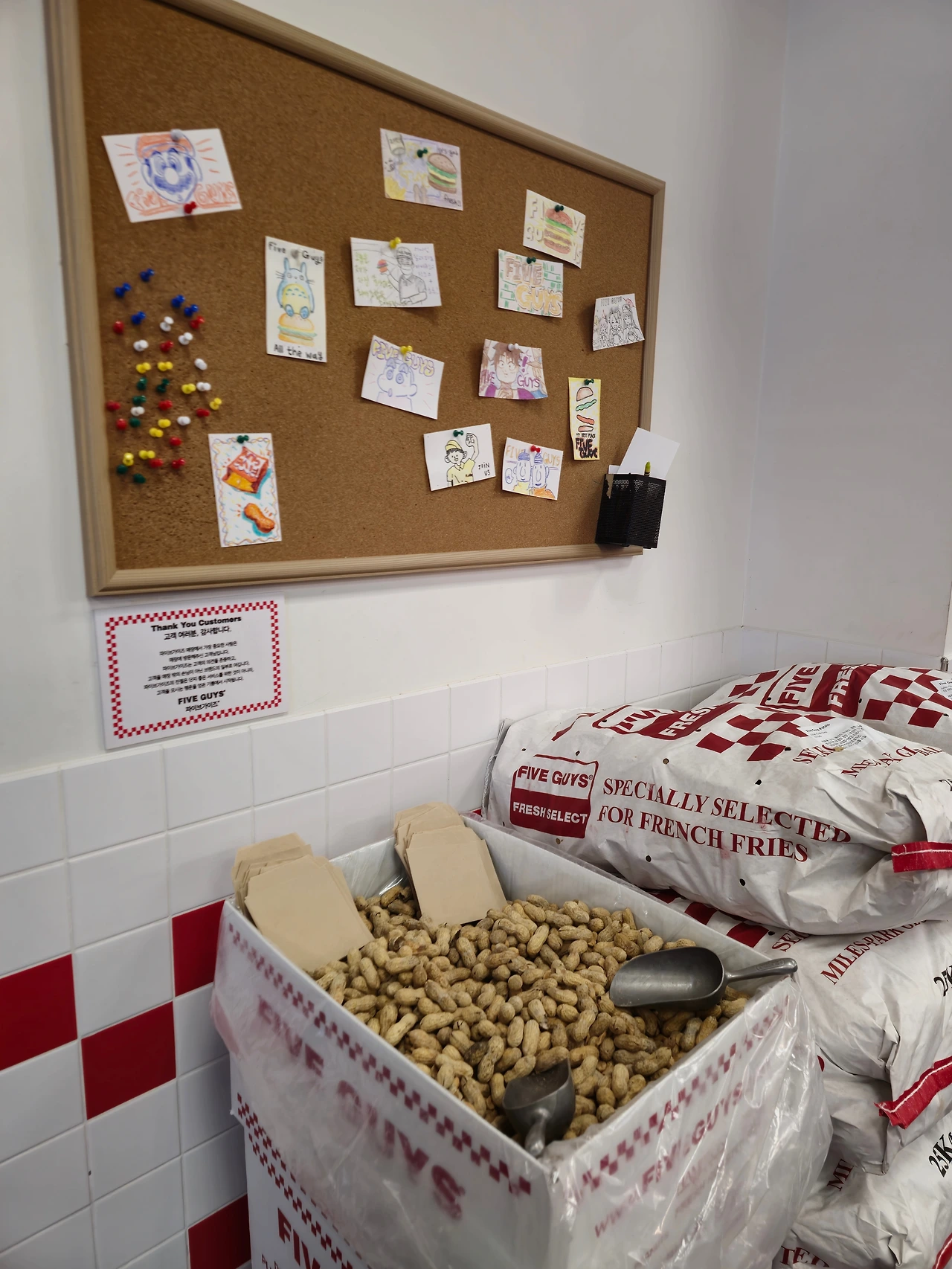 미국 뉴욕에서 처음 먹었던 파이브가이즈가 한국에 들어온 지 2년이 지났다. 반포 신세계 백화점 지하에서 신발을 보고 지나가다가 웨이팅이 없어 드디어 파이브가이즈를 한국에서도 맛보게 되었다. 현지에서는 잘 알지 못해서 땅콩을 먹을 생각도 못하였기에 이번에는 제대로 즐겨보자는 마음으로 주문하게 되었다.