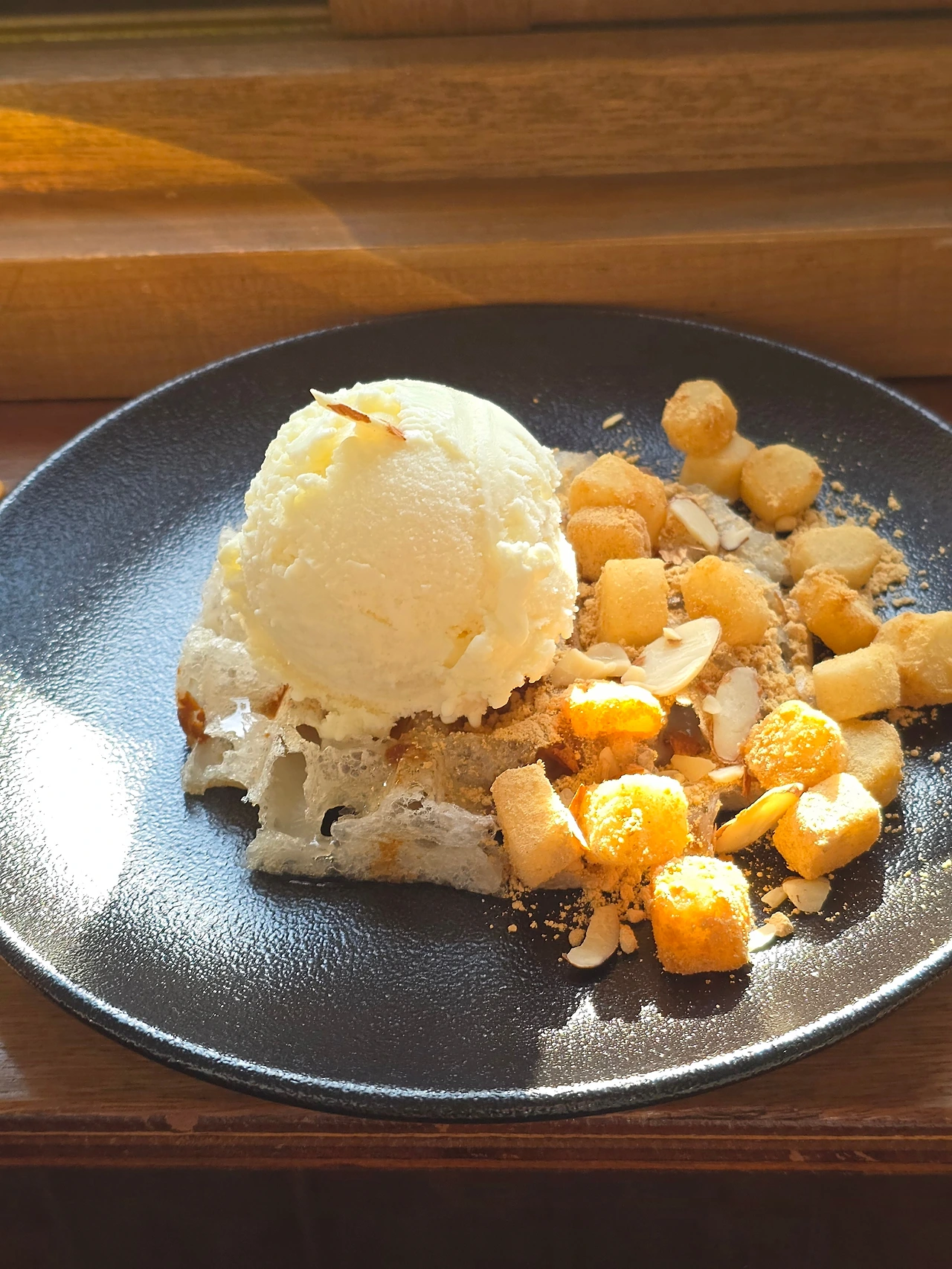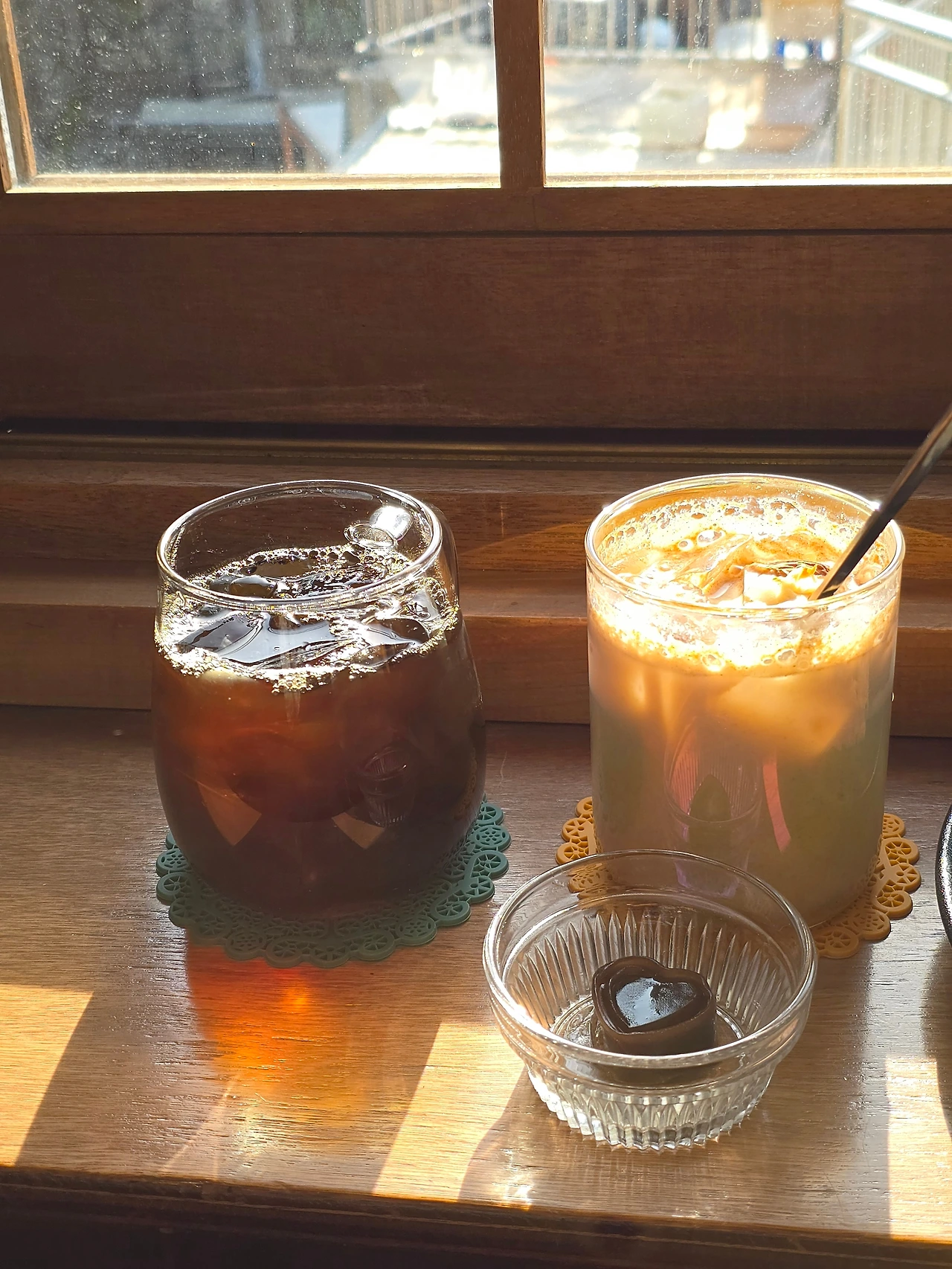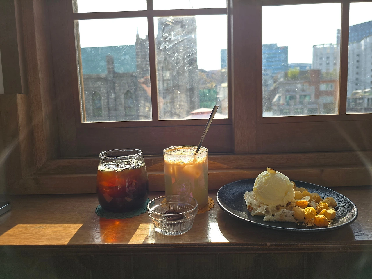 커피집 블렌딩(아이스)과 흑임자 라떼, 그리고 인절미 와플을 주문했다. 계단집 블렌딩은 커피를 내려주시는데 시간이 좀 걸린다. 산미를 좋아하는 사람은 좋아할 맛이었다. 흑임자 라떼는 조금 달긴 했지만 맛있었다. 인절미 와플은 인절미는 와플 기계로 넣은 듯한 매우 쫄깃한 느낌이었다. 다른 곳에서 느낄 수 없는 맛이었다.