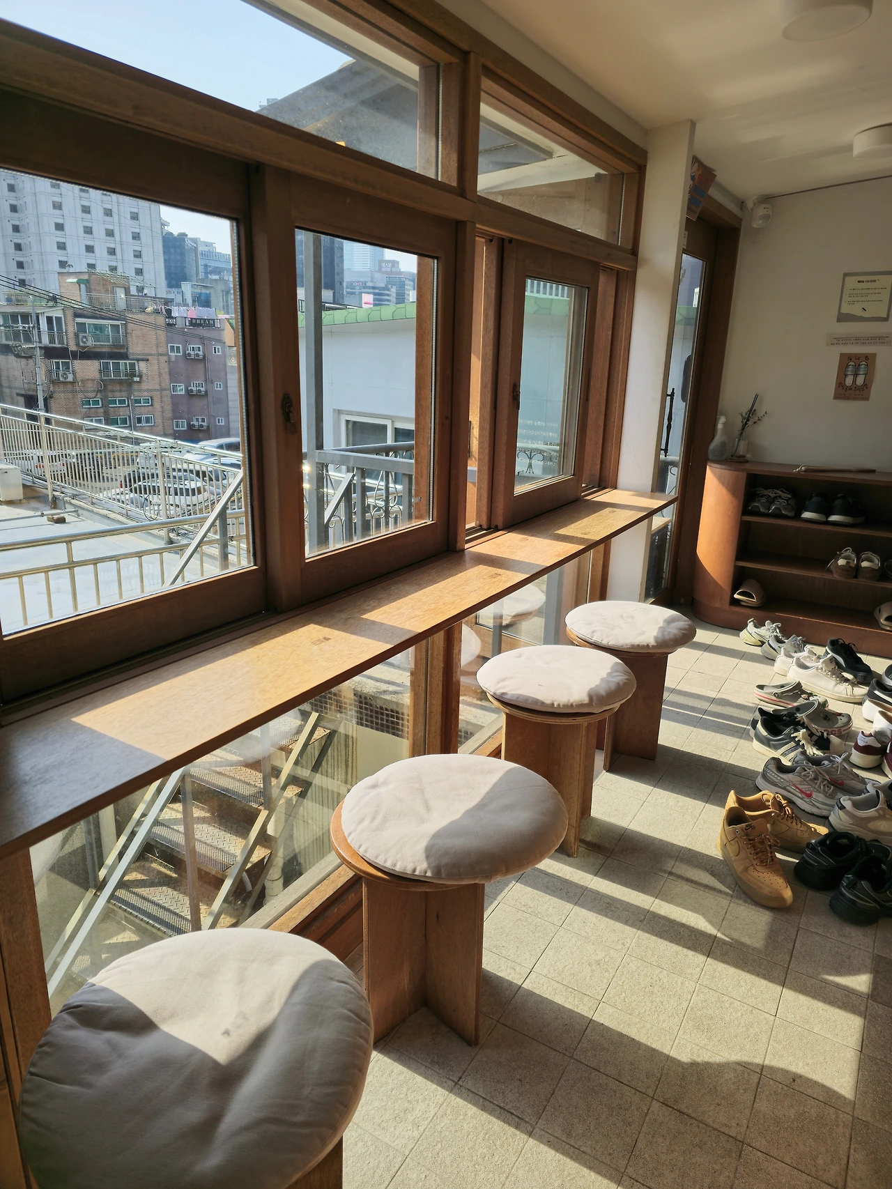 주문은 1층에서 가능하고 그 옆에 자리도 있다. 창문 밖에는 바로 옆에 붙어있는 돌담이 보인다. 2층으로 올라가는 방법은 건물 밖에 새롭게 설치된 계단이다.