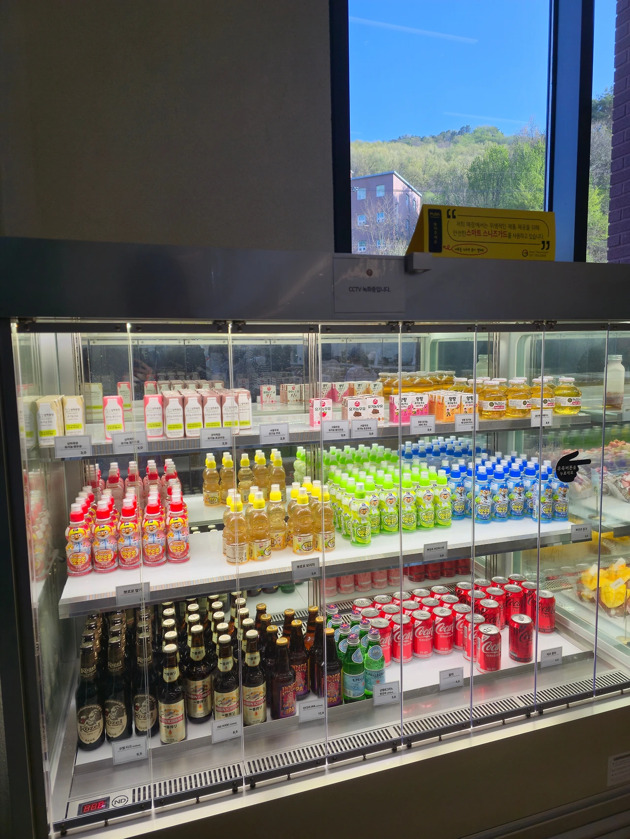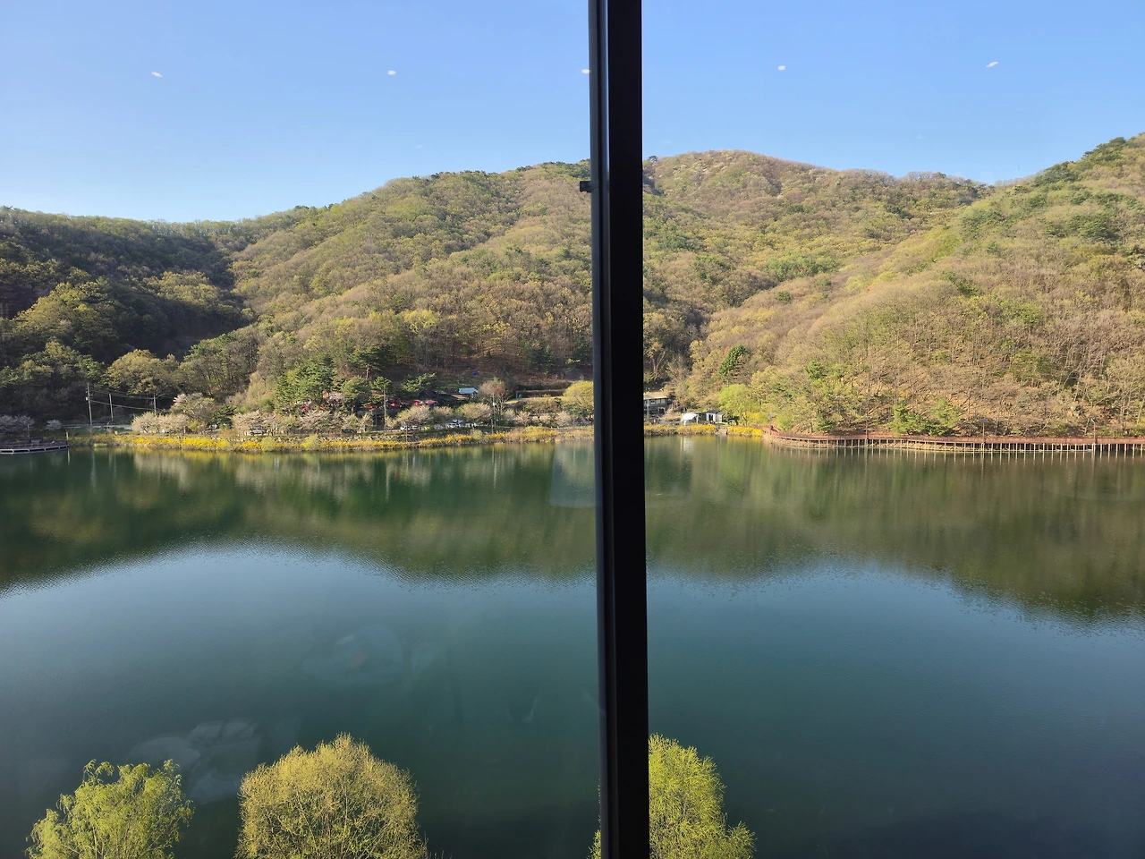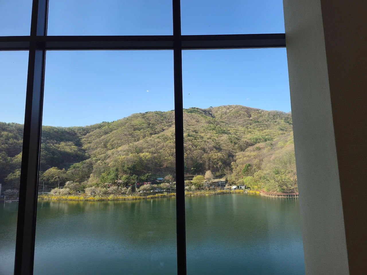 저수지 쪽은 모두 유리로 되어 있고 그 면도 매우 넓어 자리가 대충 봐도 각 층 별로 10개 이상은 되어 보였다. 저수지 뒤에 푸른 나무들이 보여서 계절의 변화도 잘 느낄 수 있을 것 같았다.