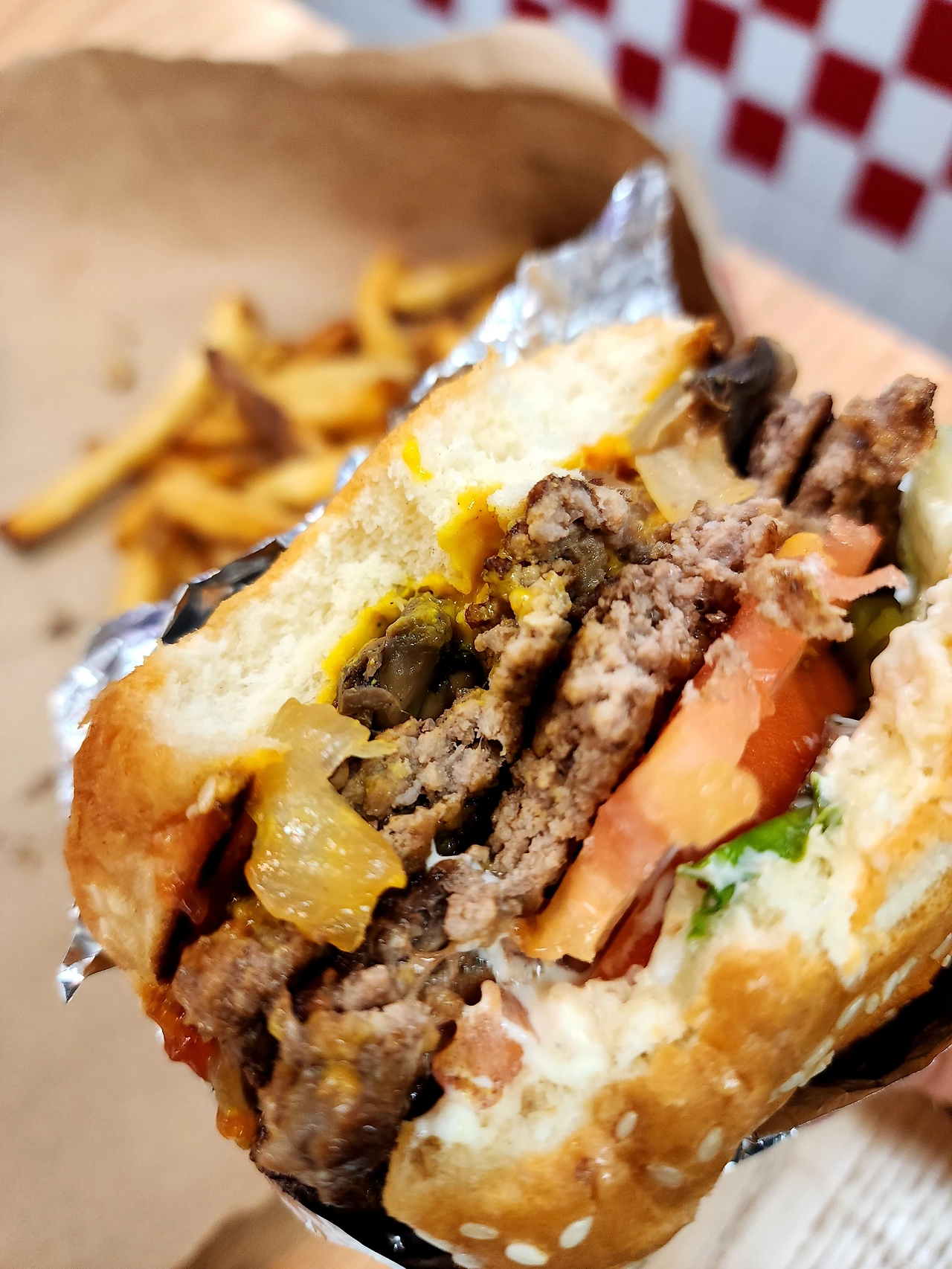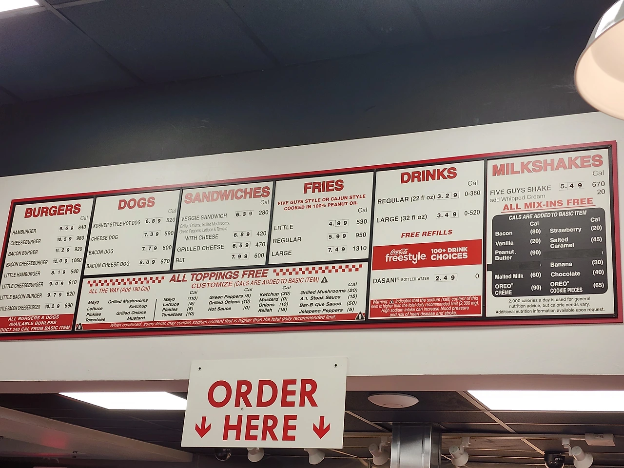 3-4시 정도였기에 사람은 거의 없어 기다림 없이 바로 주문했다. 메뉴는 근본 맛집답게 많지 않았다. 배고파서 패티 두 장짜리 기본 버거, 감자튀김을 주문하고, 파이브가이즈버거는 땅콩기름으로 조리하는 것으로 유명하며, 풍족한 미국 답게 매장 안에 땅콩도 쌓여있다.