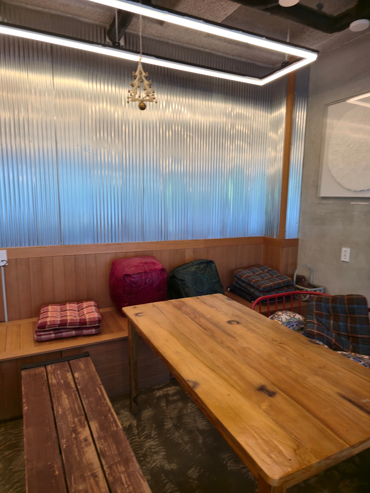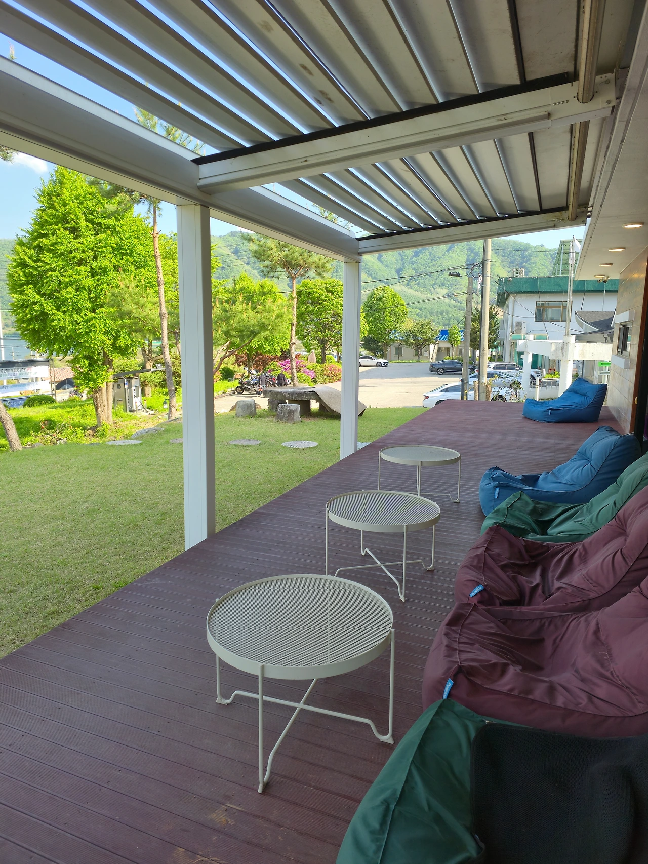 따뜻한 느낌의 실내 분위기와 야외에는 빈백과 여러 자리가 있어 편하게 높은 지대에서 보이는 앞에 흐르는 강을 볼 수 있다.
