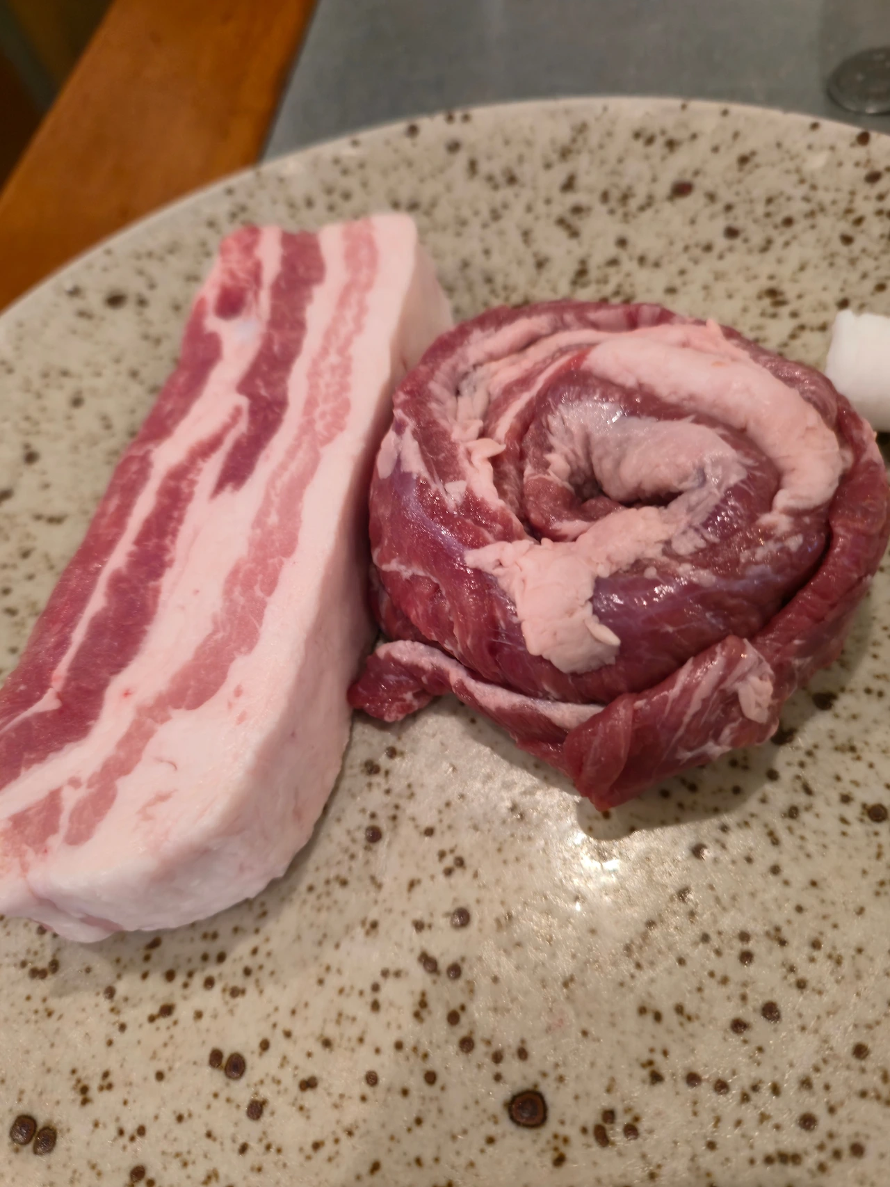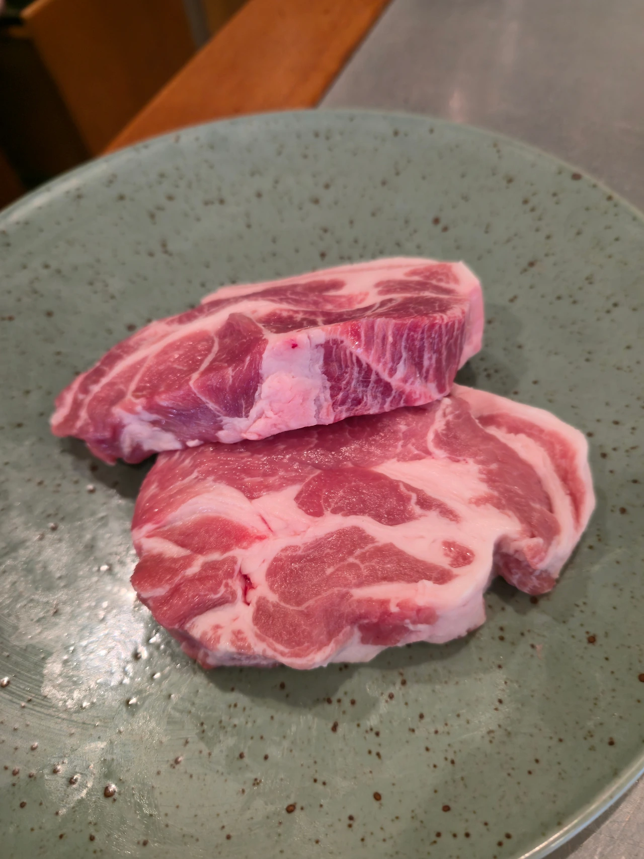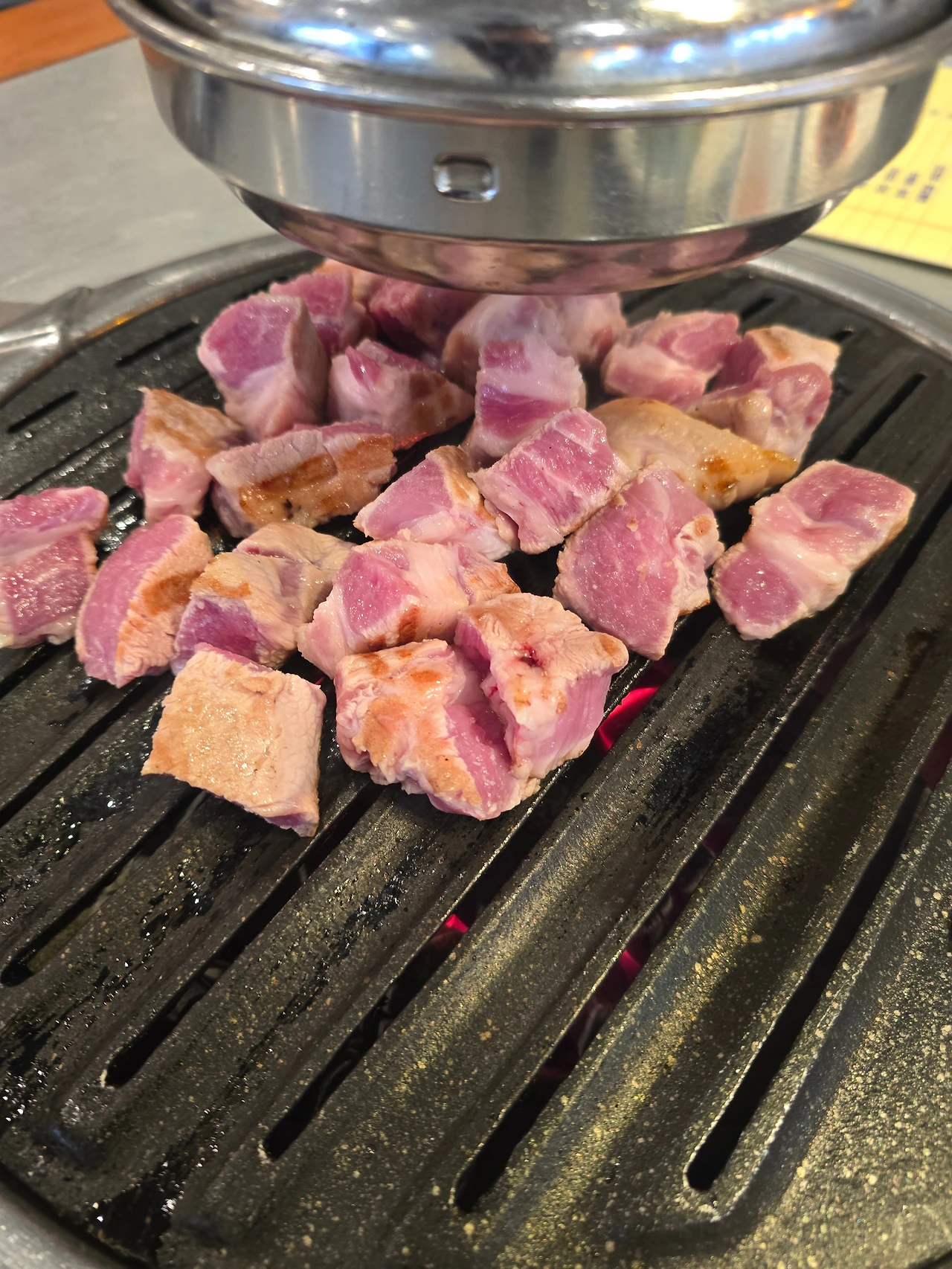 점원이 목살을 강력하게 추천하여 KOKUMI 목살 2인분을 먼저 시키고 이후에 삼겹살과 가브리살 1인분씩 추가하였다. 여기서 KOKIMI는 풍부한 맛이라는 일본어이라고 하며 새로운 맛의 후보라고 들었다. 나랑 아내는 삼겹살을 압도적으로 선호하는 편이라 목살을 주문하면서도 반신반의하였다. 그러나 점원이 자신 있게 목살을 추천하시는 이유는 점원분께서 맛있게 구워주신 뒤에 한 조각 먹고 나서 알 수 있었다. 보통의 목살은 비교적 퍽퍽한 느낌을 많이 받았다면, 이곳 목살은 삼겹살보다 더 풍부한 육즙을 느낄 수 있었다.