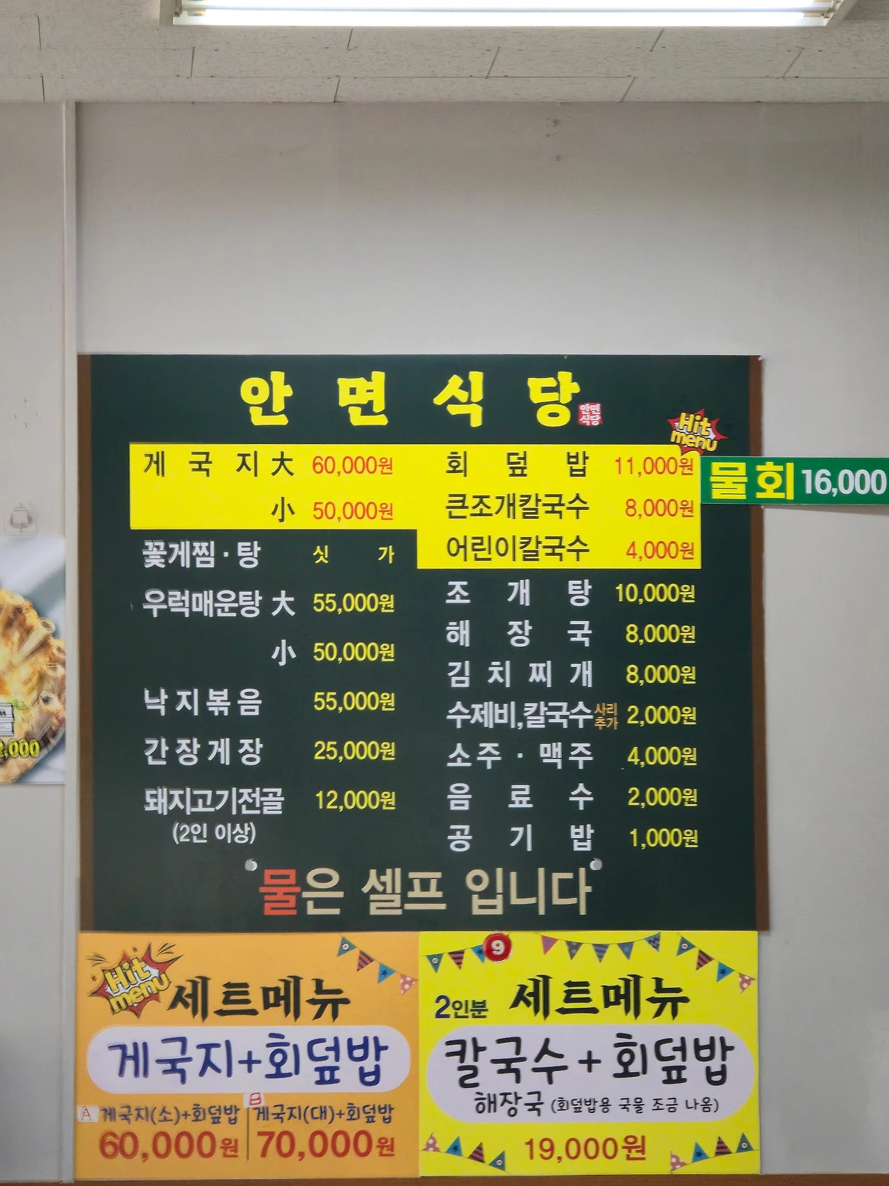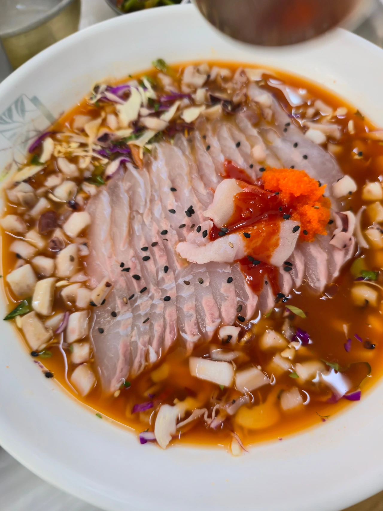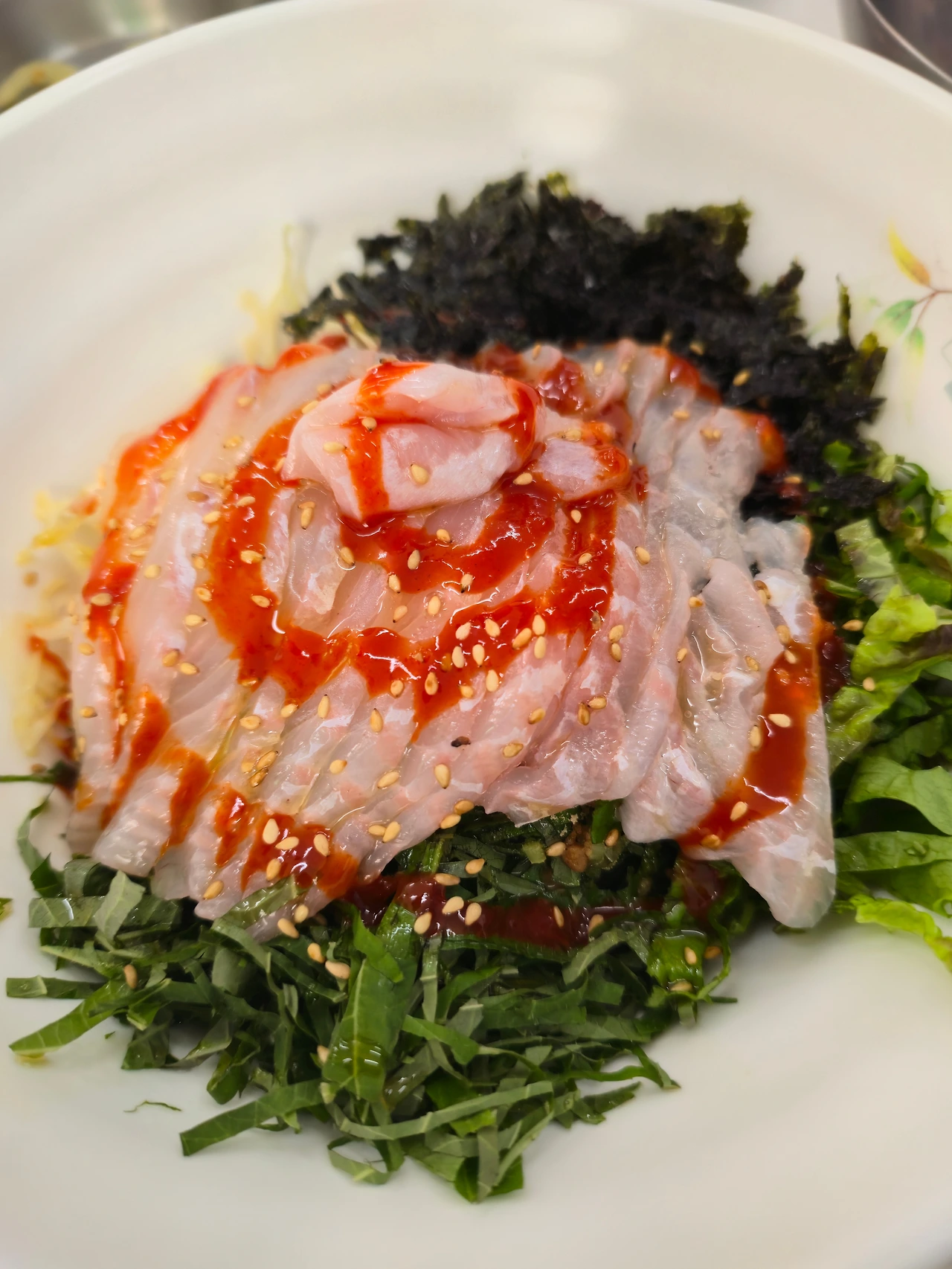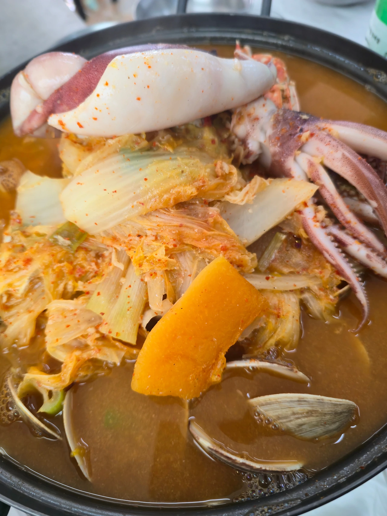바로 게국지와 낙지볶음, 회덮밥, 그리고 물회까지 다양하게 주문했다. 게국지는 충청남도 서산·태안 지역의 향토 음식으로 겨울에 먹고 남은 게장 국물에 배추, 무청 등을 절여 숙성시킨 후 찌개로 끓여 먹는 찌개이다. 꽃게탕과 비슷해 보이나 조금은 다른 느낌이라고 한다. 믿거나 말거나 사장님이 자신은 이곳 토박이라며 이곳에서는 진짜 게국지를 맛볼 수 있다고 하여 더욱 맛있게 즐길 수 있었다.
