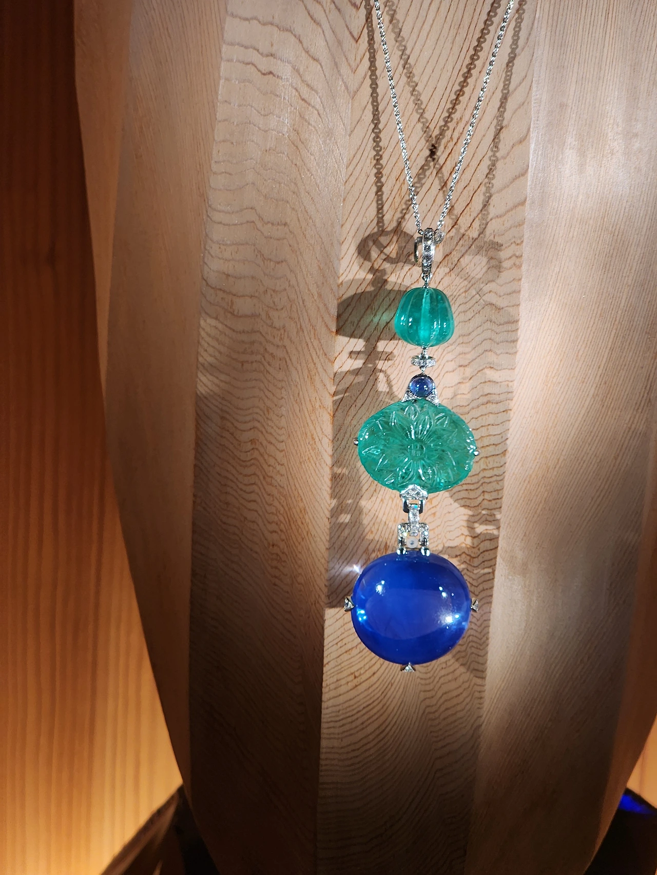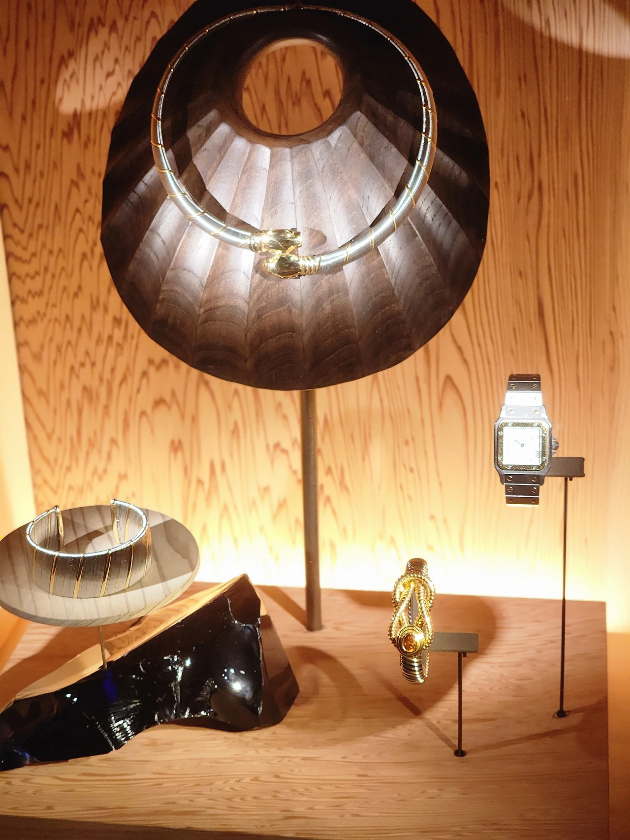 그다음으로 '소재의 변신과 색채'라는 주제로 일본 삼나무로 만든 전시함으로 구성되어 있었다. 규화목 같은 나무와 아름다운 원석 등을 가공해서 만들거나 플레티넘 등을 선구적으로 액세서리에 도입한 제품들이 전시되어 있다.