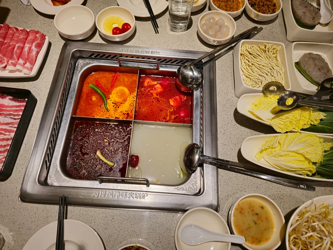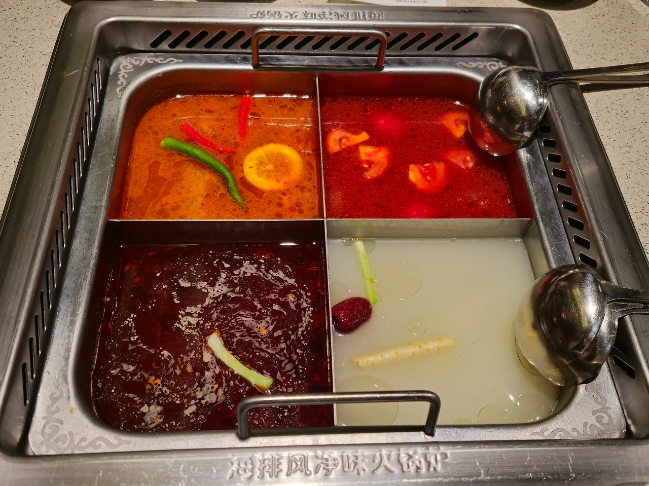 입장을 하게 되면 바로 주문을 패드를 통해서 하게 된다. 셀프바는 필수로 선택하고, 탕의 종류를 고른다. 탕은 보통 4탕으로 3가지 탕을 주문하는 것이 국룰이라고 한다. 매운 청유마라훠궈, 시원한 버섯탕 그리고 단 토마토탕훠궈를 자주 시키는 것 같았다. 우리는 버섯탕훠거대신 몸보신을 위해 삼계탕훠궈를 주문하려는 그때, 와이프가 똠양꿍탕훠궈도 먹고 싶다고 해서 결국 4탕을 꽉 채웠다.