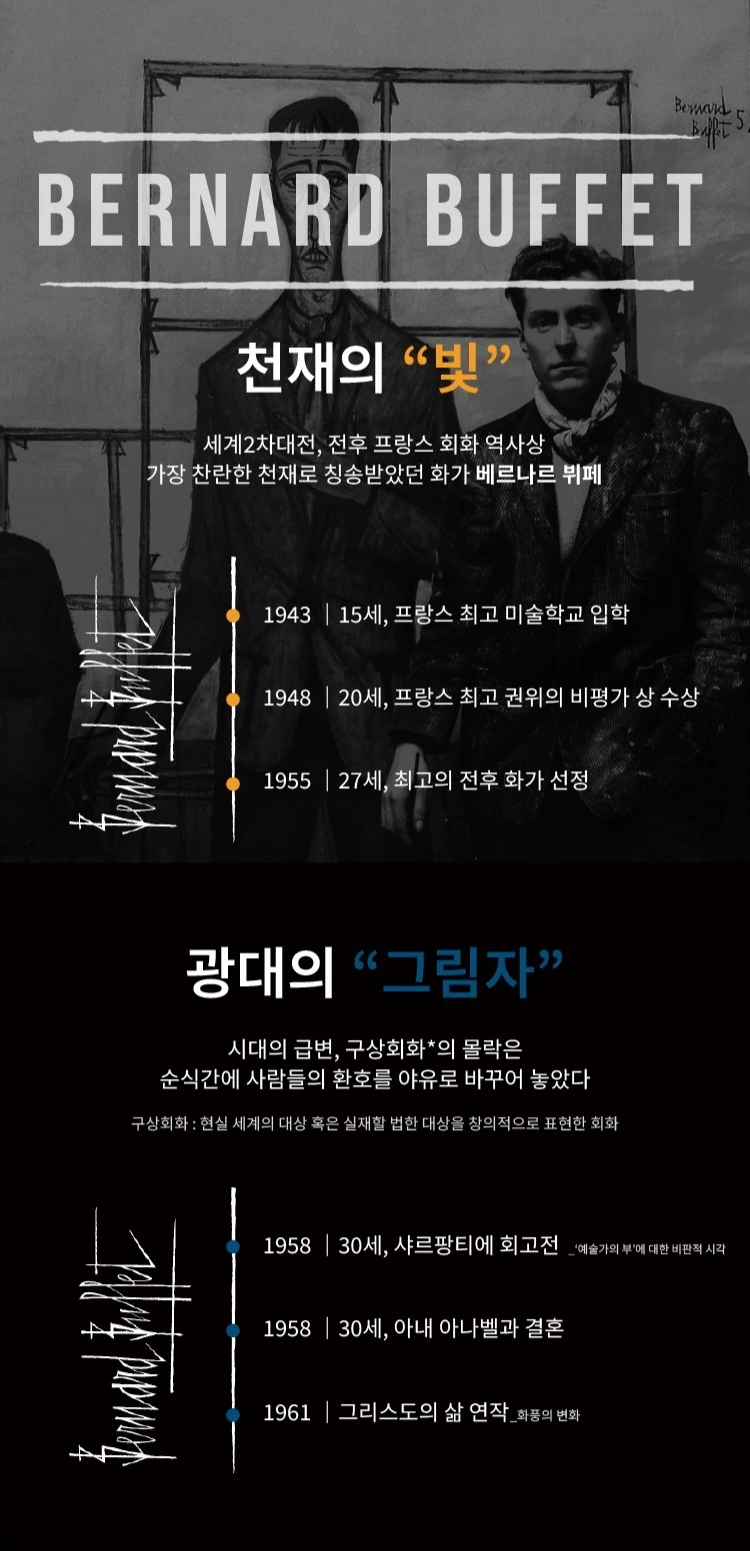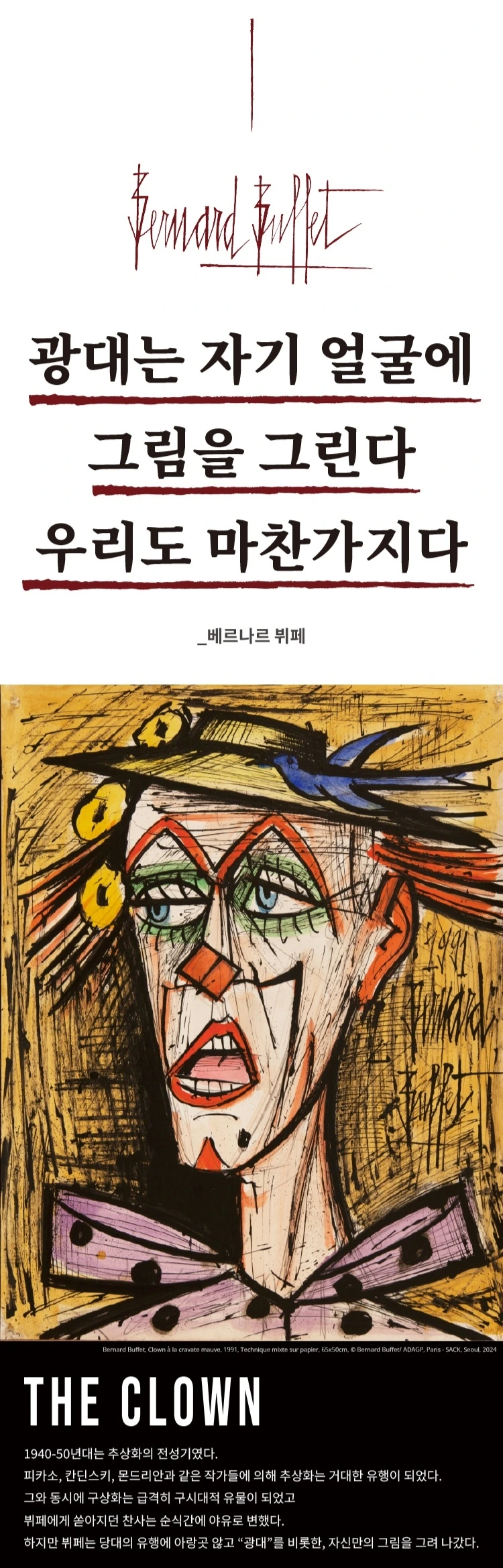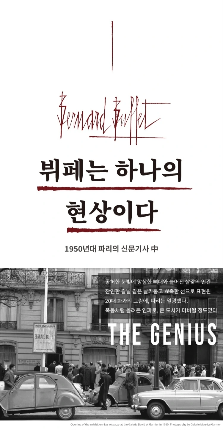 이번 전시는 부제부터 시작되어 구성까지 베르나르 뷔페에 대해 빠지게 된 계기가 됐다. 젊은 시절의 성공, 변화하는 시대 속 고집, 인생의 뮤즈와 만남, 그리고 질병과 결국 자살까지 인생의 매 순간도 영화 같았던 그의 삶을 보고 베르나르 뷔페라는 화가를 알게 되어 좋았던 전시였다