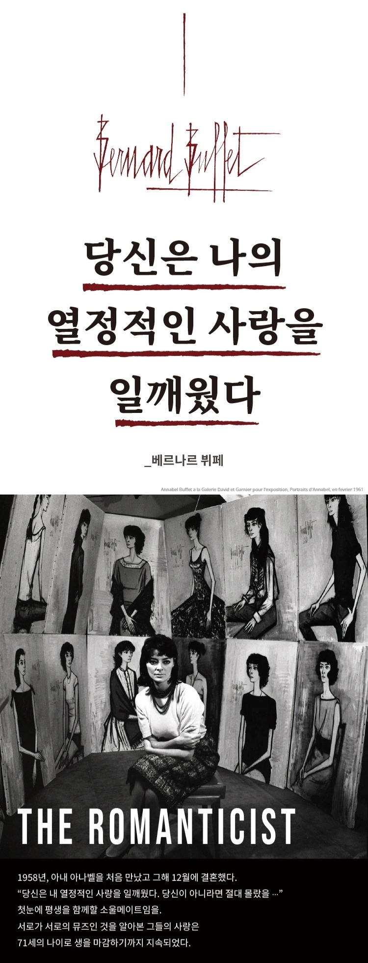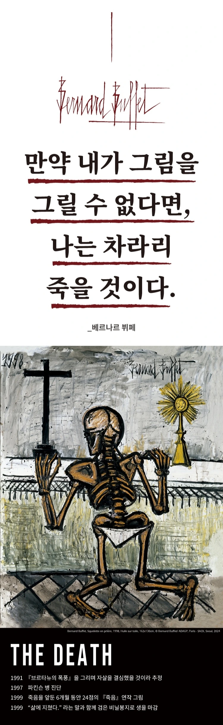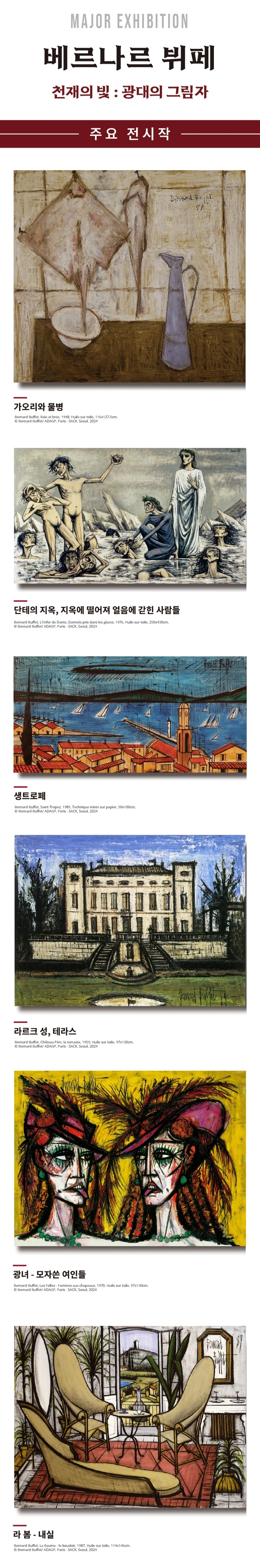 이번 전시는 부제부터 시작되어 구성까지 베르나르 뷔페에 대해 빠지게 된 계기가 됐다. 젊은 시절의 성공, 변화하는 시대 속 고집, 인생의 뮤즈와 만남, 그리고 질병과 결국 자살까지 인생의 매 순간도 영화 같았던 그의 삶을 보고 베르나르 뷔페라는 화가를 알게 되어 좋았던 전시였다