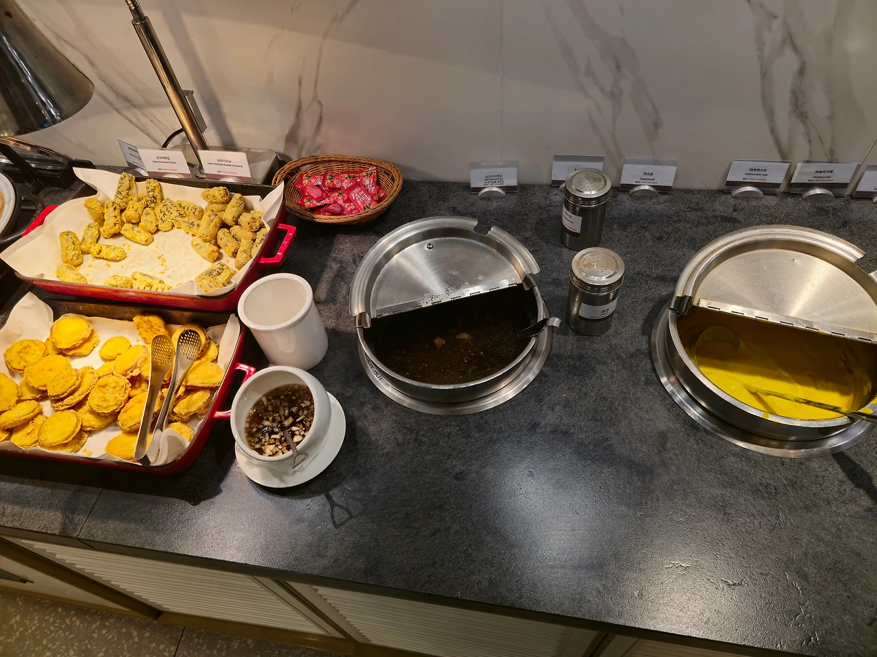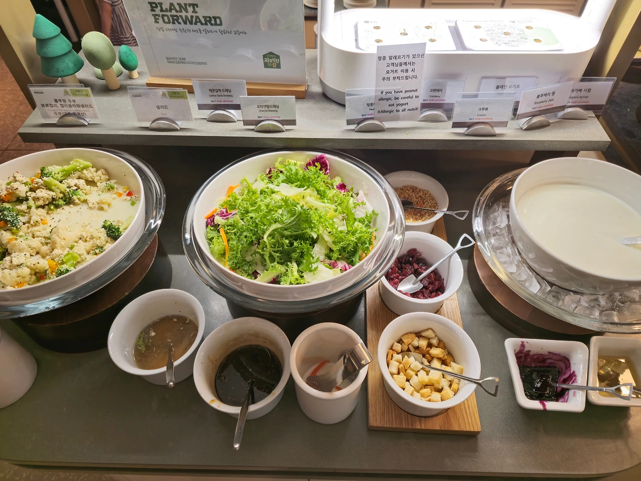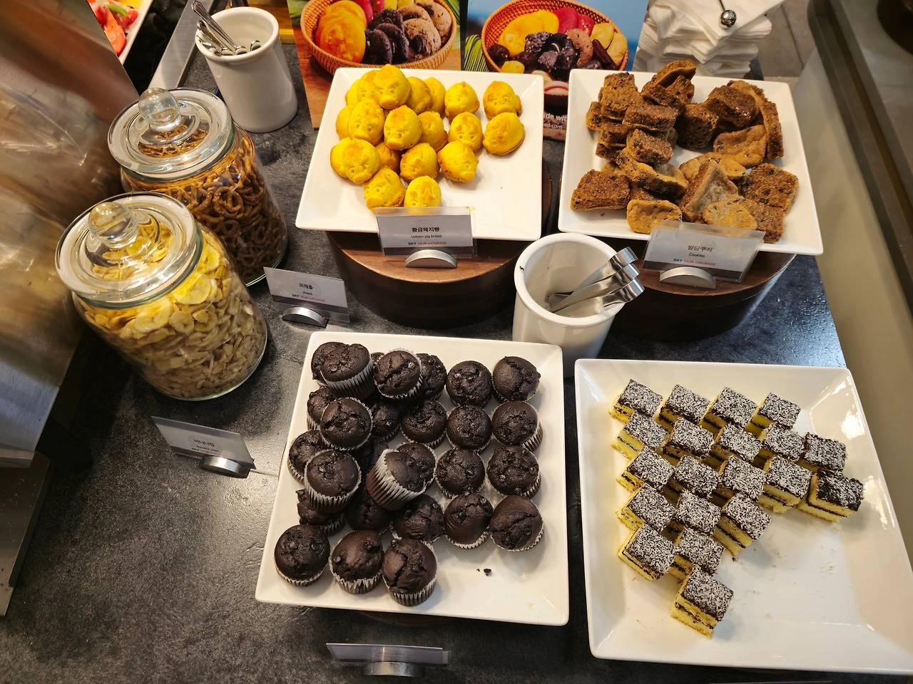 우리 가족은 어렸을 때부터 해외여행을 갈 때엔 꼭 공항 라운지를 들린다. 특히 이번 패키지는 티웨이항공을 이용하게 되어 점심 기내식이 포함되어 있지 않고, 저녁도 거의 7-8시 넘어서 예정되어 있기 때문에 더더욱 라운지를 가야 할 이유가 있었다. 이번에는 스카이허브라운지를 가게 되었는데, 생각보다 단백질로 된 음식이 많았고, 손님들이 많아 음식 순환이 빨라서 그런지 방금 한 듯한 느낌을 받아 배부르게 식사를 했다.