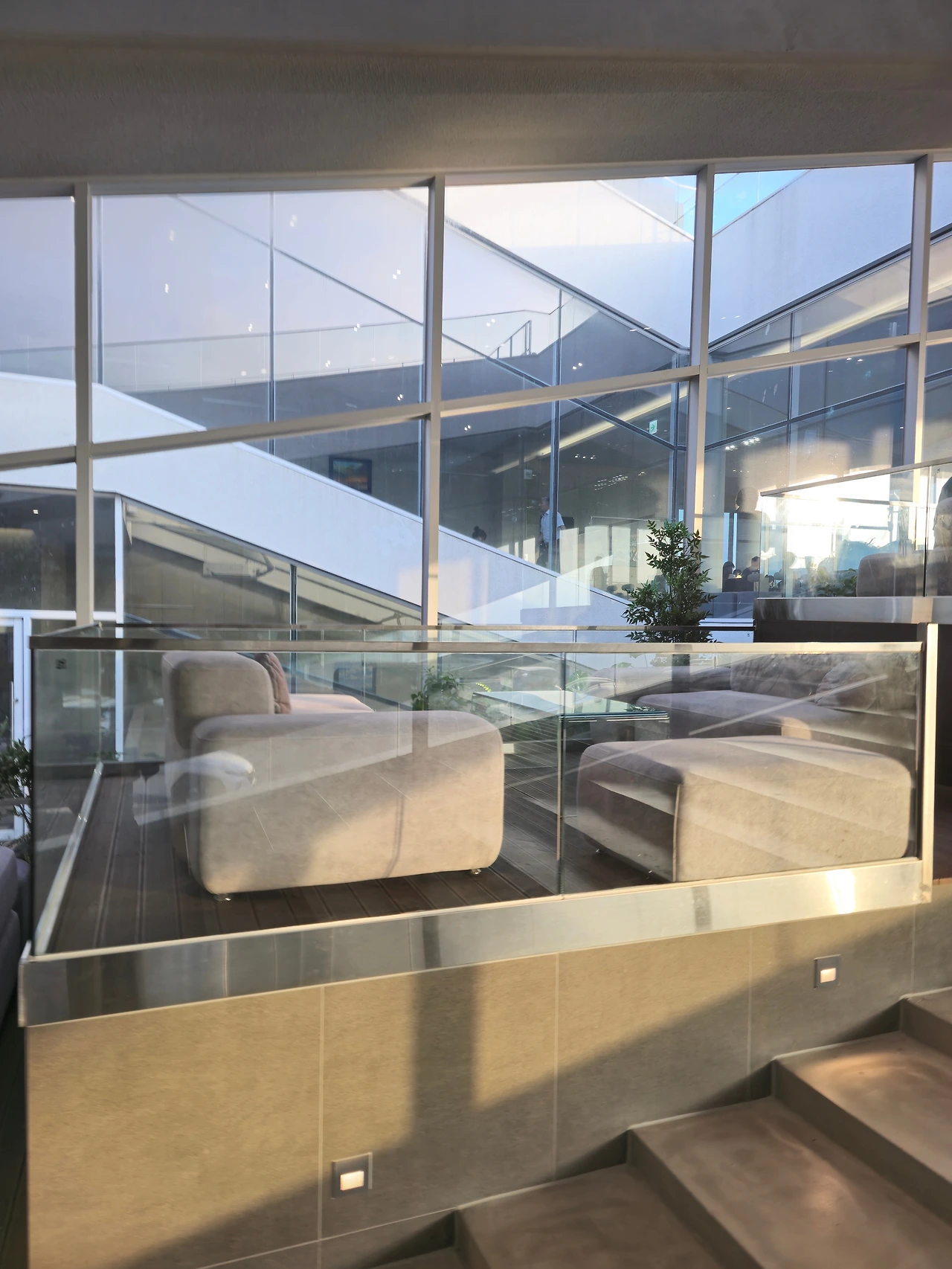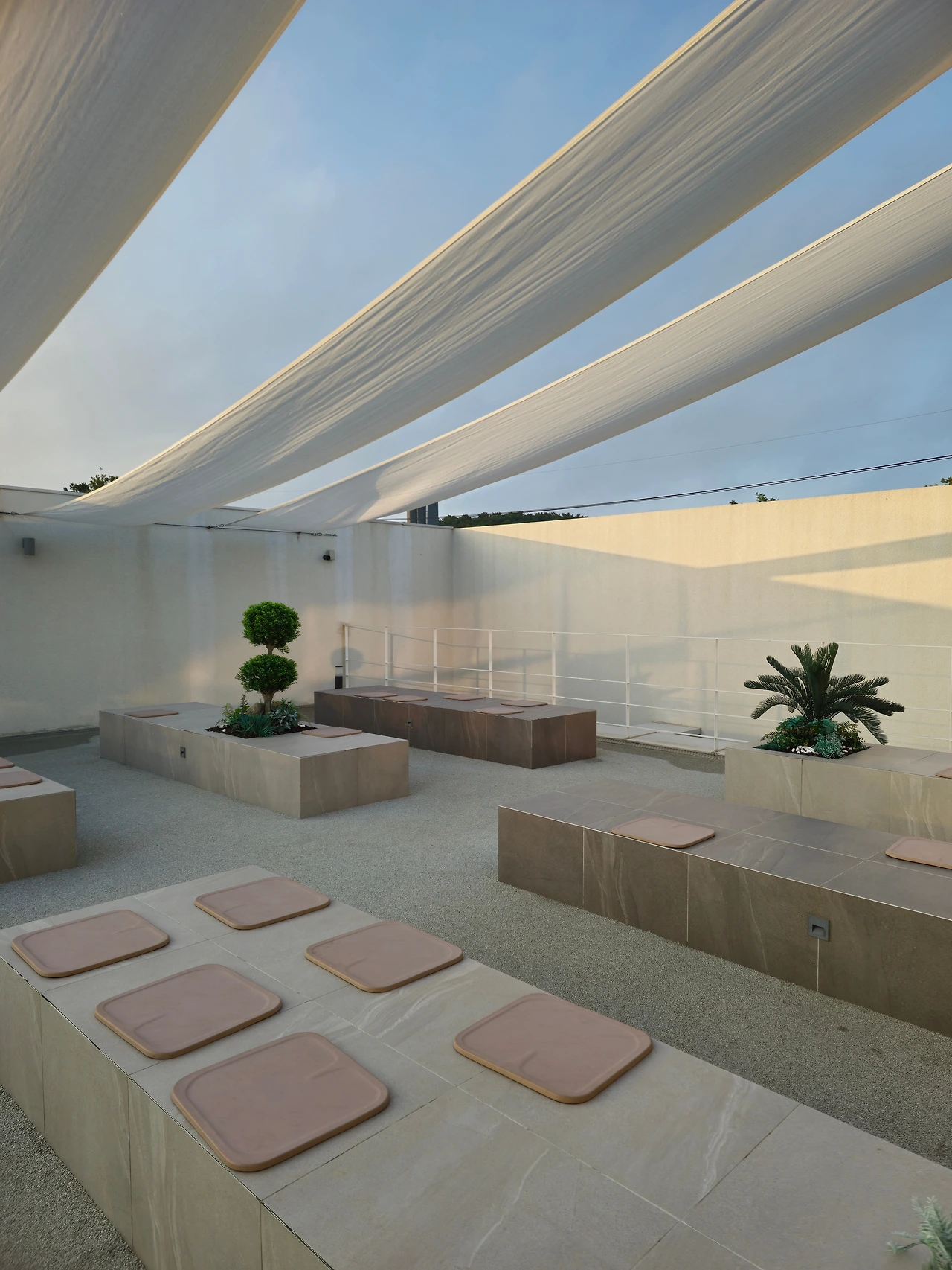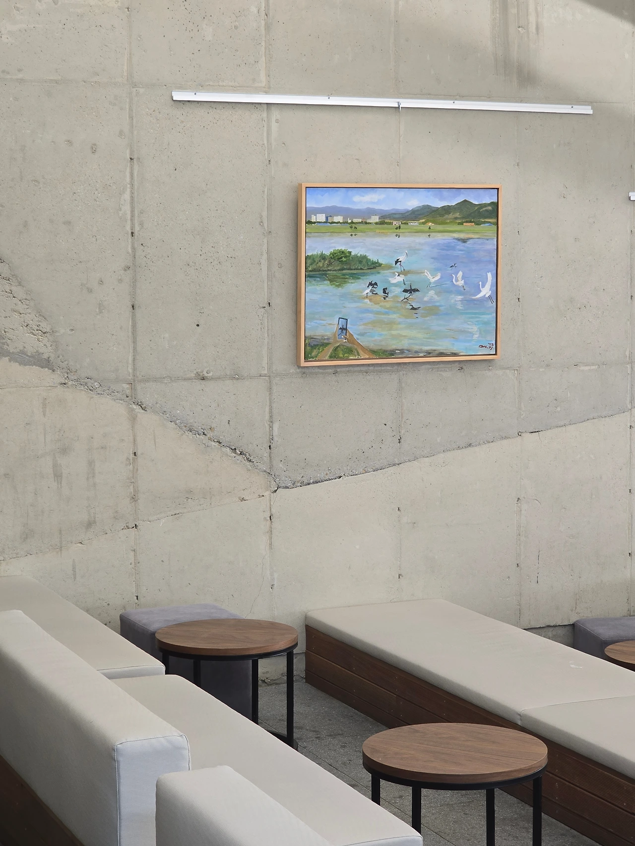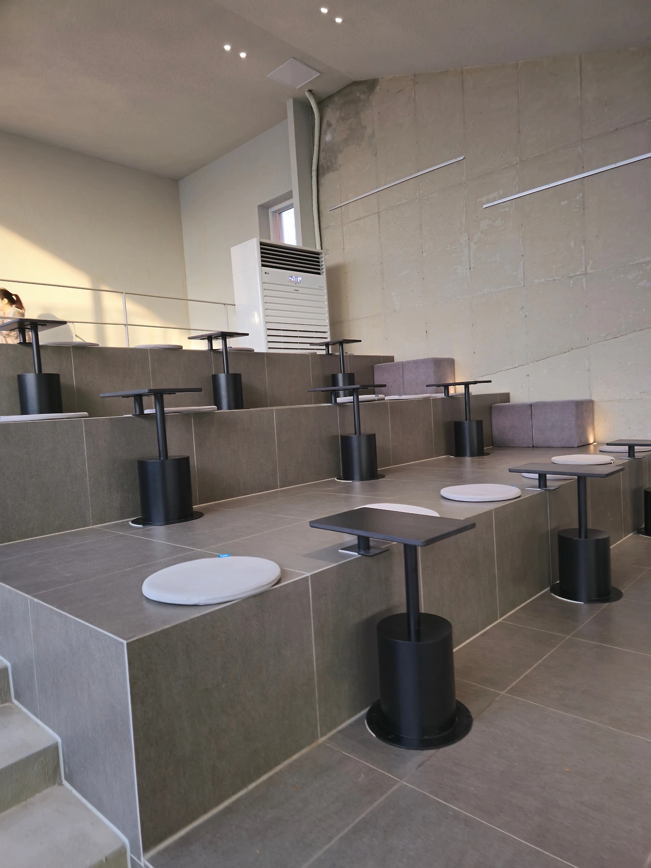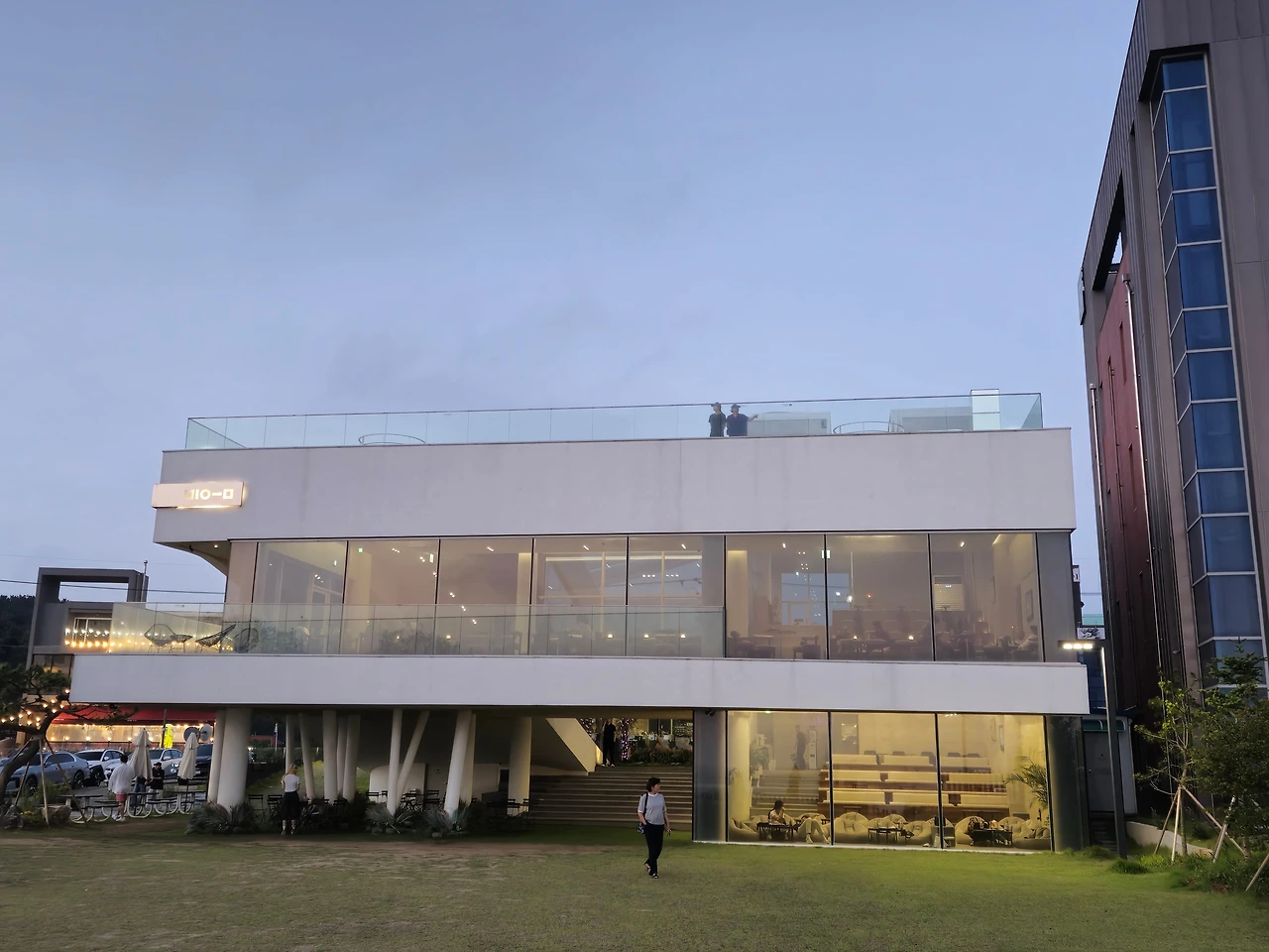 카페는 총 3층으로 되어 있고 야외에 마당과 바닷가까지 연결되어 있었다. 건물은 'ㅁ'자로 되어 있고 계속 돌아서 올라갈 수 있는 구조로 되어 있다. 통창 옆에 있는 자리들과 옥상 위에 루프탑에도 자리가 넓게 되어 있어 서해 또는 갯벌을 한눈에 볼 수 있고 저 멀리 실미도도 보인다.